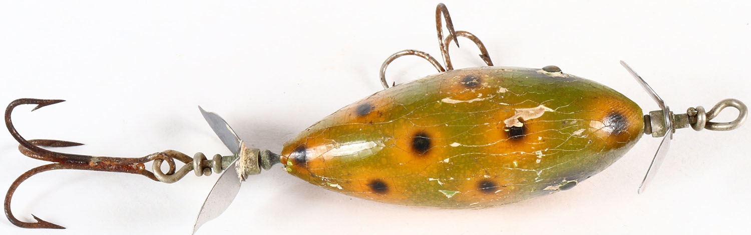 South Bend Surf Oreno, PE, wood lure with frog pattern finish, 2 hooks, unmarked, two props. Grade: Very Good - Value: 10 to 50