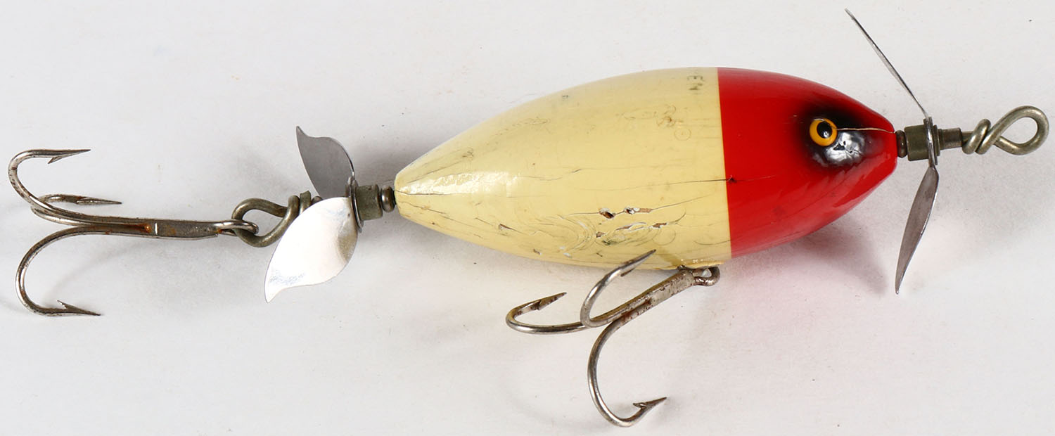 South Bend Surf Oreno, PE, wood lure with red & white finish, 2 hooks, marked on back, two props. Grade: Excellent - Value: 20 to 60