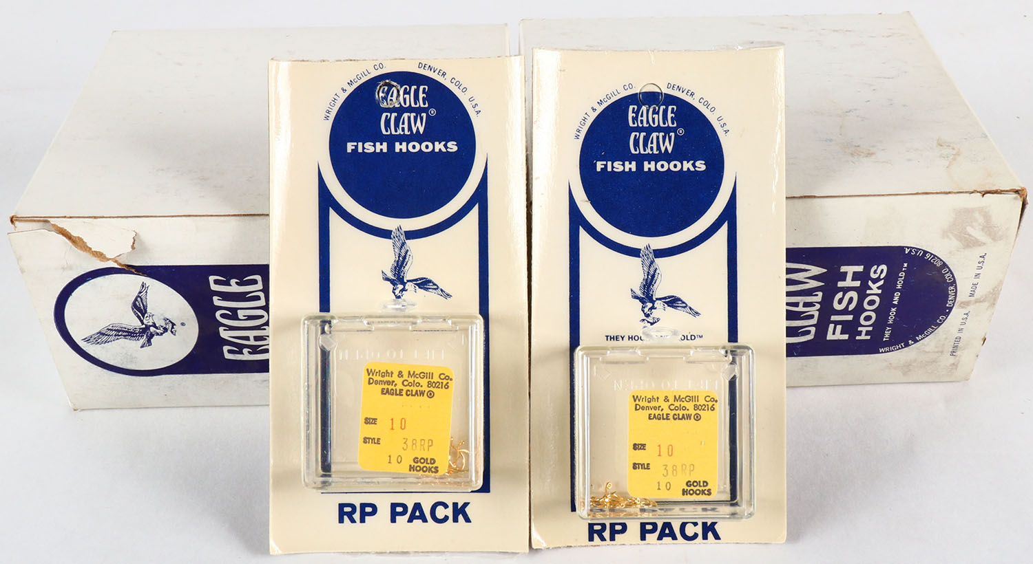 2 Cases of Eagle Claw hooks (10 per box) in original packaging, total of 19 out of 20 still remain. Grade: MINT - Value: 10 to 80