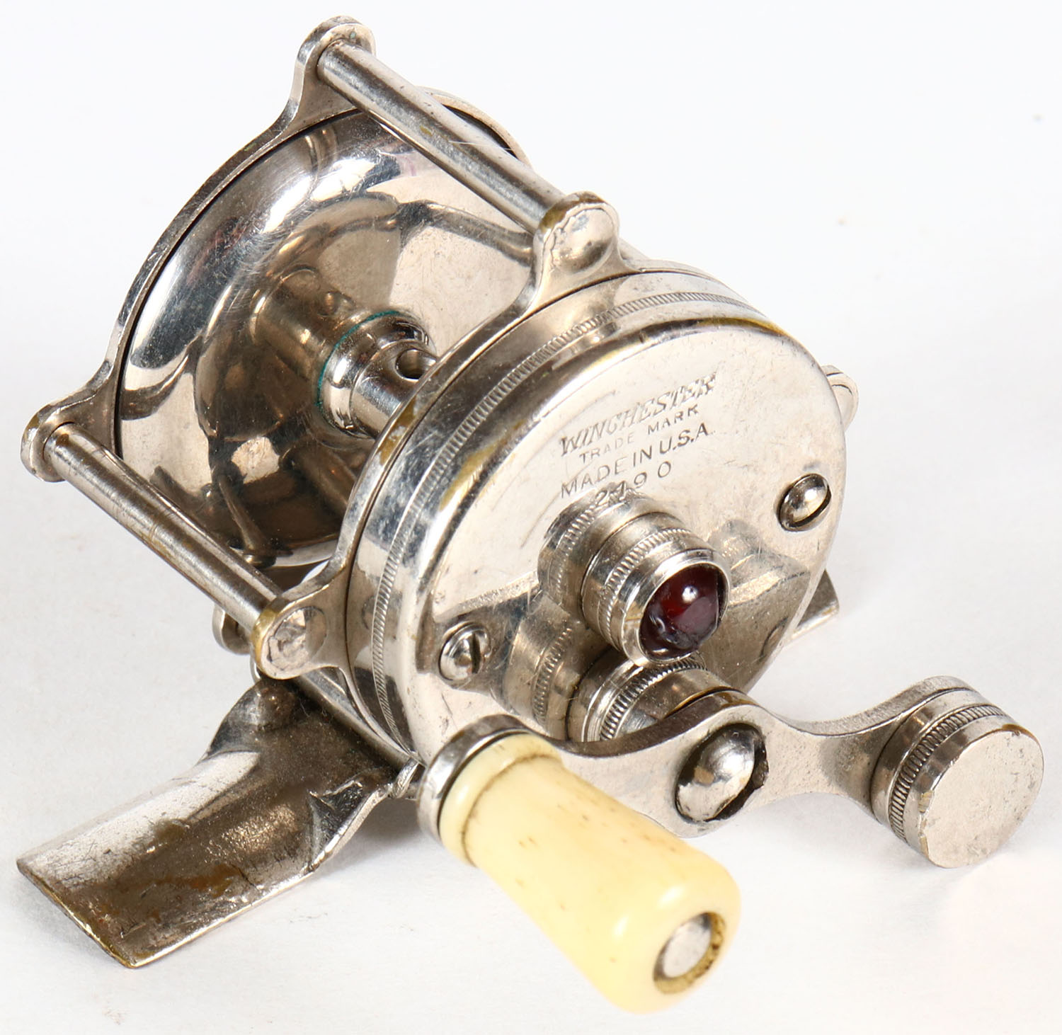 Winchester No. 2190 reel, 40 Yd., reel turns nice, single buff handle, JWL, strong click. Grade: Excellent + - Value: 30 to 100