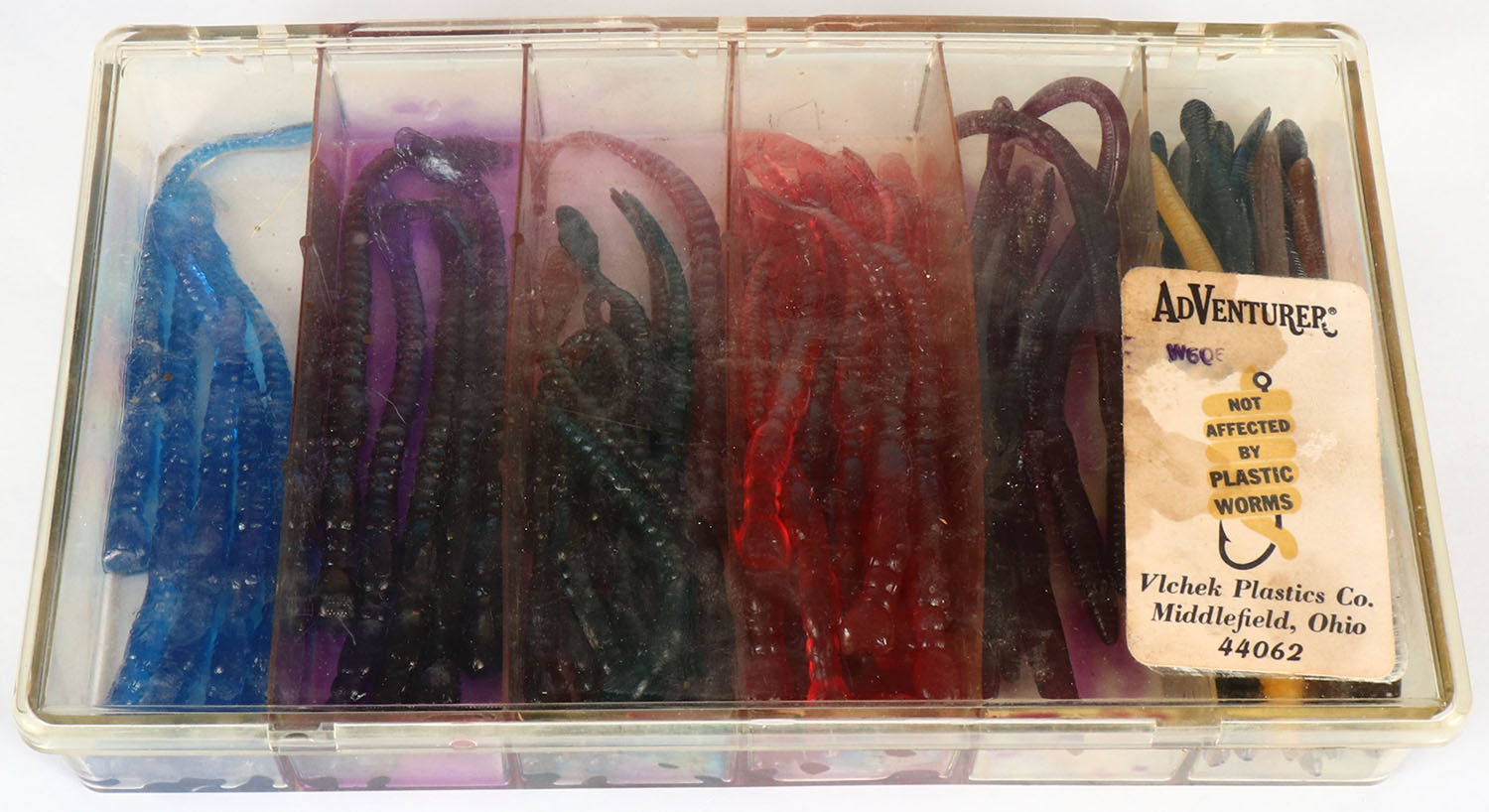 Vlchek AdVenturer plastic tackle box full of plastic worms. Grade: Excellent - Value: 2 to 30