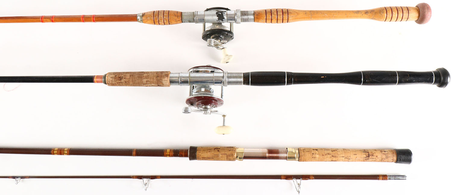 Lot of 3 fishing rods, two are surf rods with reels, one of those is made of bamboo. Grade: Excellent - Value: 10 to 50