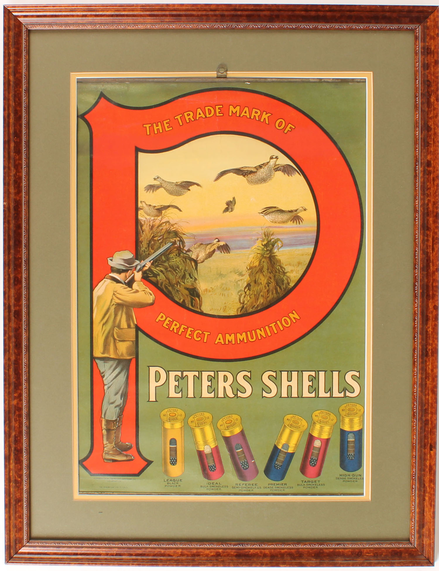 EXCEEDINGLY RARE Peters Poster, pictures large red P with hunter shooting prairie chickens in upland hunting scene, also pictured are six window shot shells, has metal bands top & bottom with brass hanger, dated 1911, has been professional repaired near top (about 1 1/2'' wide band from left side to edge of red P on the other side just above the birds) and light fading to top left corner otherwise all original, has fantastic colors, framed & matted, ONLY ONE WE HAVE EVER SEEN! Grade: Excellent - Value: 2000 to 6000
