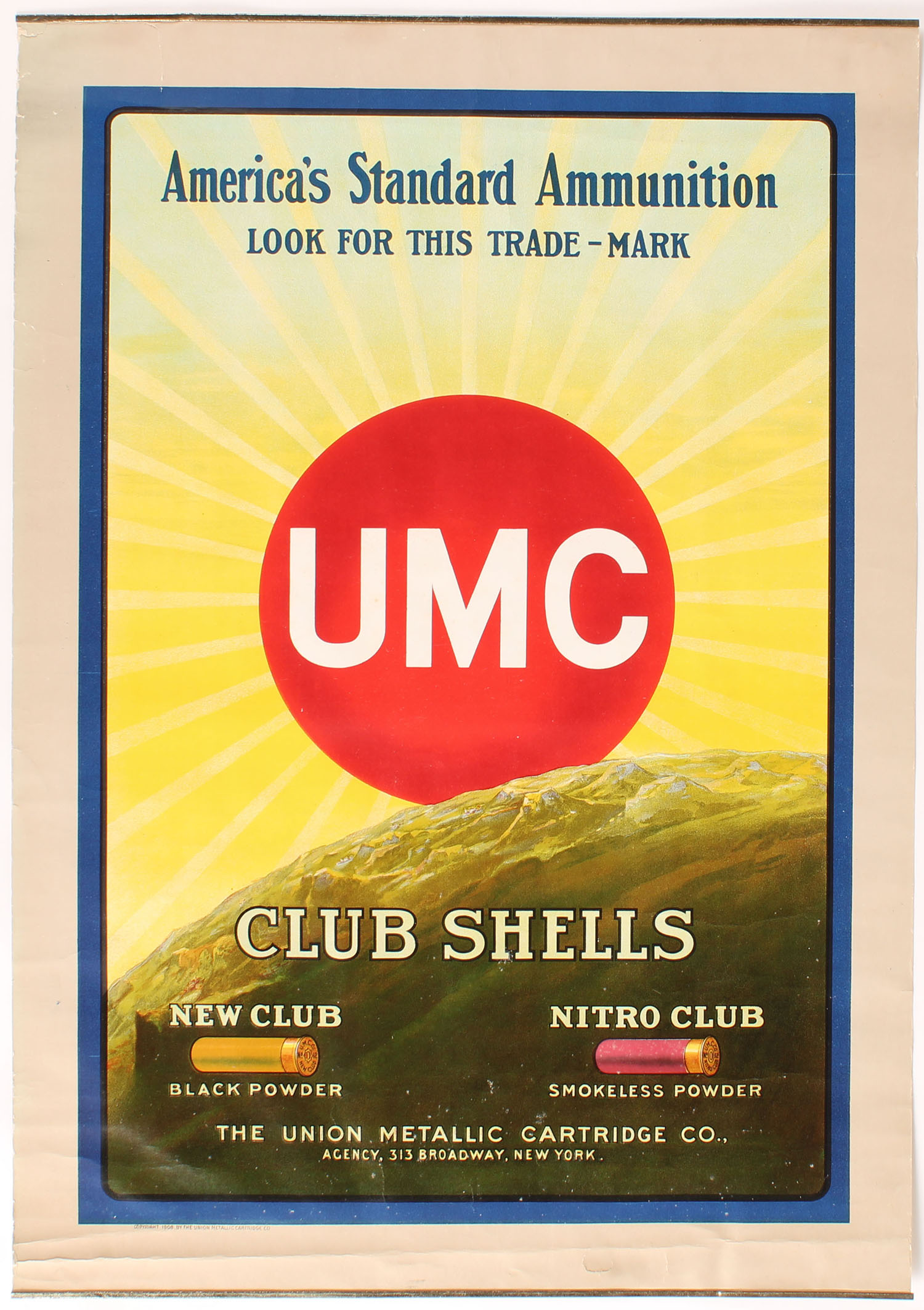 RARE! UMC Poster, CLUB SHELLS, pictures large red UMC dot logo with starburst & New Club & Nitro Club shot shells, has metal bands top & bottom with no brass hanger, 20'' x 28 1/2'', circa 1908, stunning colors with almost no wear. VERY RARE & FIRST ONE WE HAVE OFFERED! Grade: Excellent + - Value: 2000 to 5000