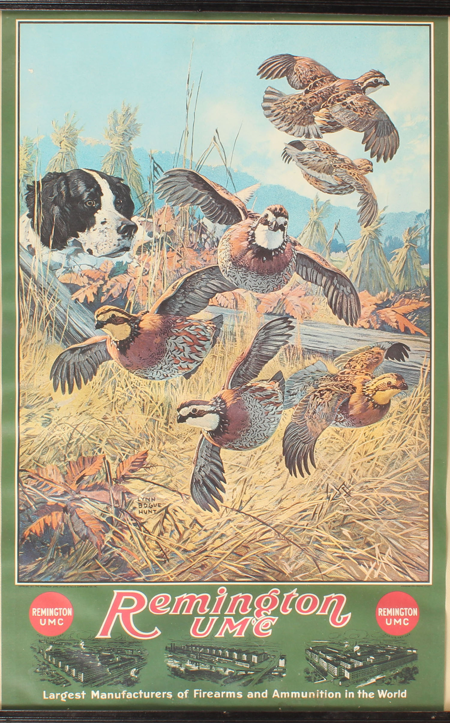 Remington Poster, these were reproduced in 1970 by Remington, pictures dog flushing a covey of quail, near perfect colors, framed, 19'' x 29'', no bands. Grade: Excellent ++ - Value: 20 to 100