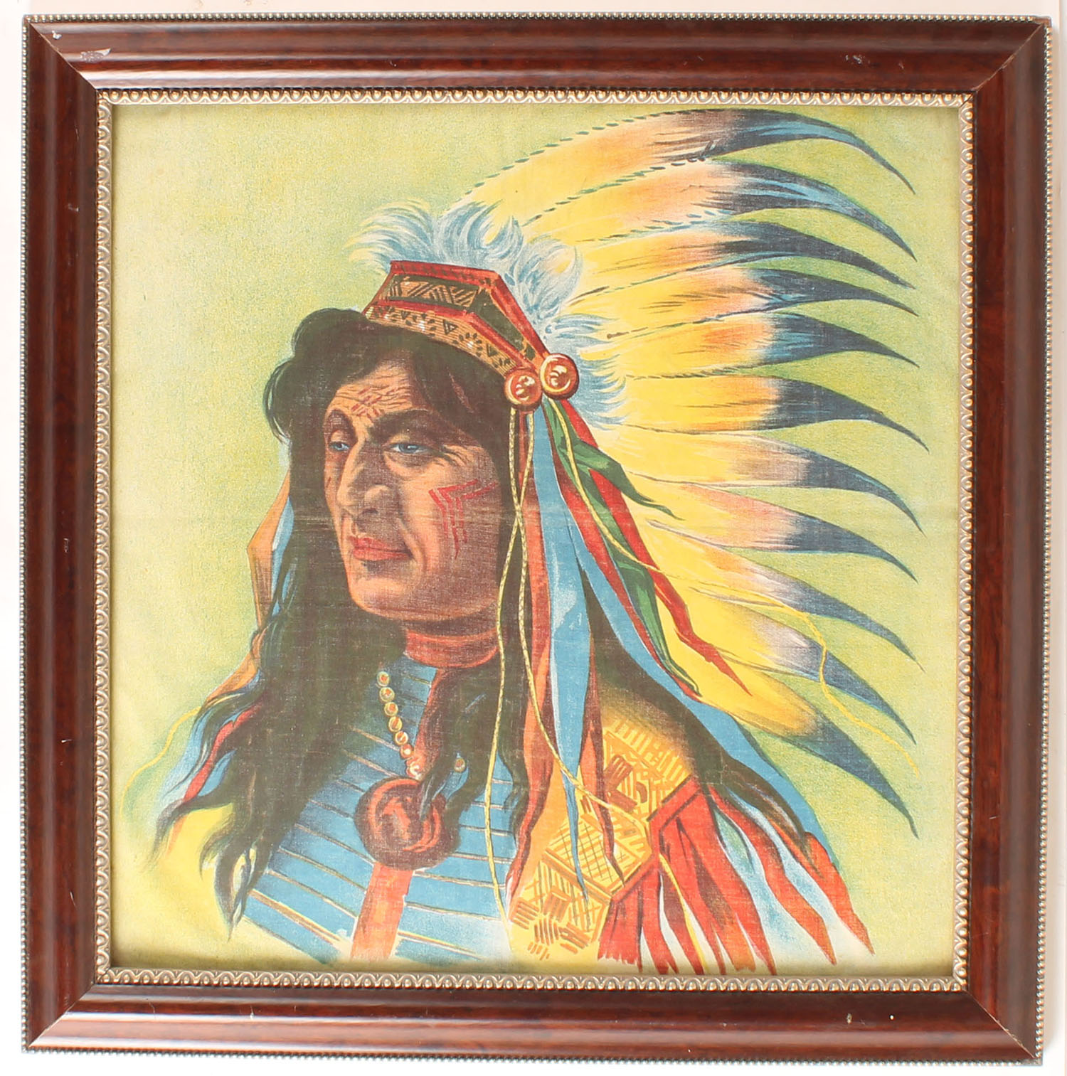 Indian with headdress litho on cloth, vivid colors, image size 19'' x 19'', framed. Grade: Excellent - Value: 20 to 100