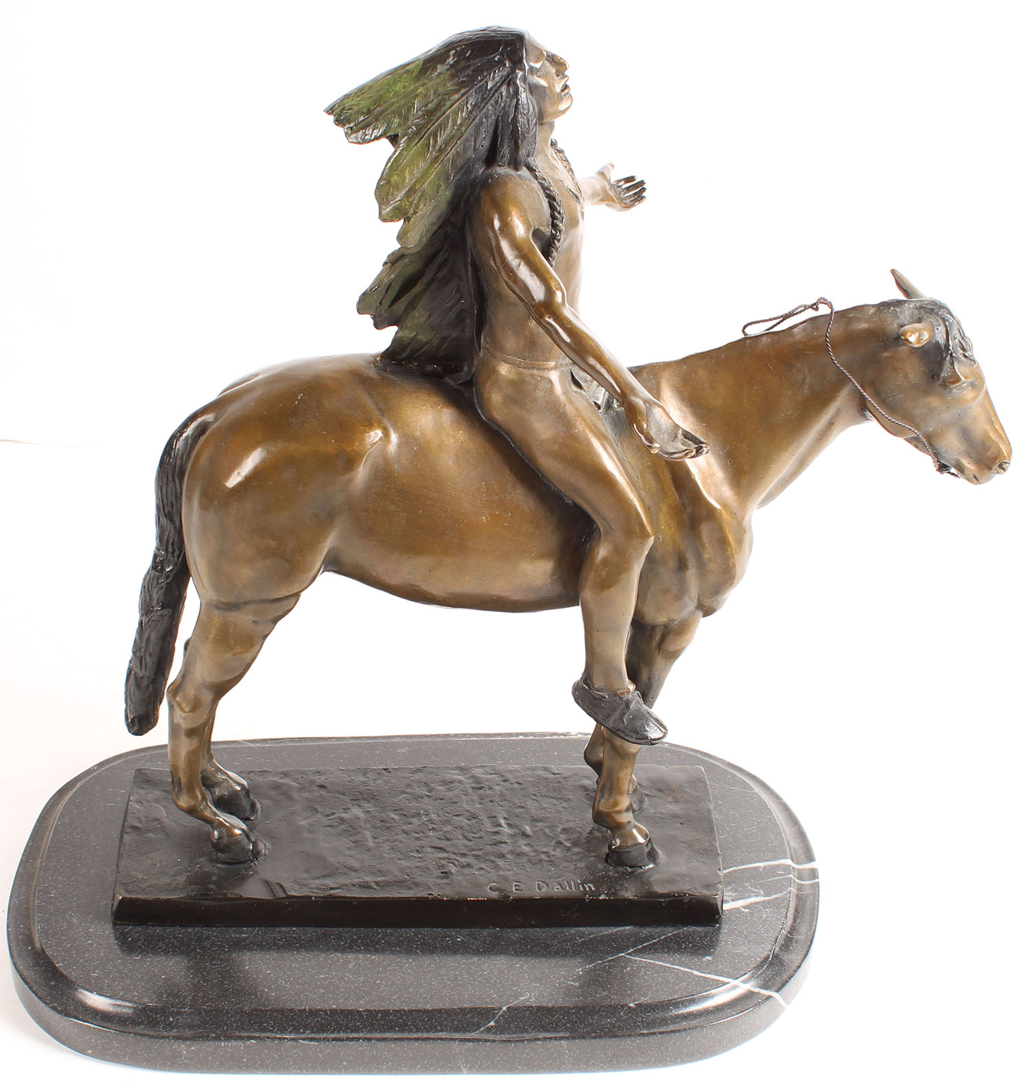 Cyrus Edwin Dallin, ''Appeal to the Great Spirit'' presents a Native man on horseback wearing a feathered headdress, his head raised and arms outspread in communion with a divine power. 17'' x 18'', signed on base of bronze, circa 1916. Grade: Excellent - Value: 200 to 800