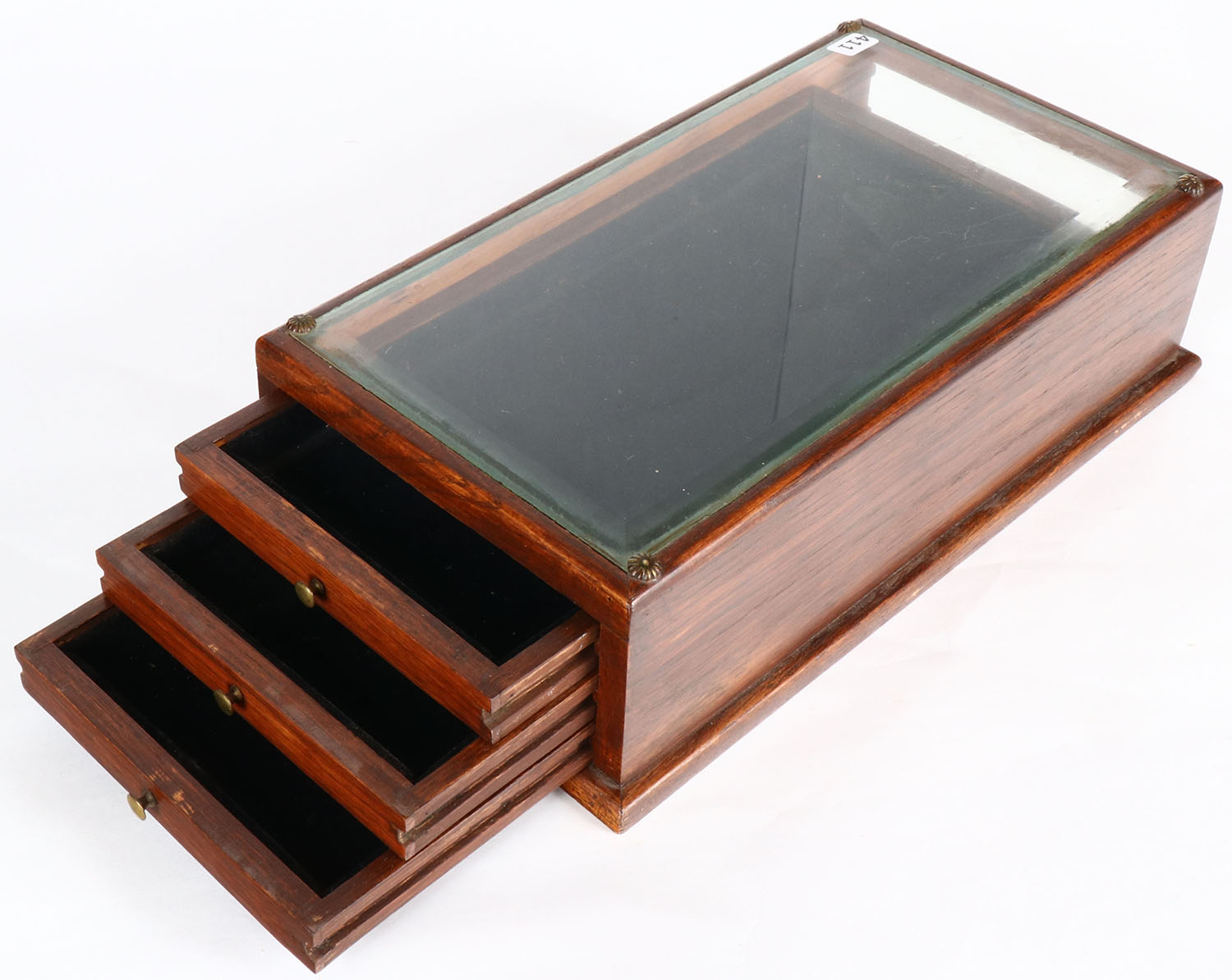 Antique wood and glass display case, 3 draws the pull out of either end, 15 1/2'' x 9'' x 4'', some soiling but all solid. Grade: Excellent - Value: 50 to 200