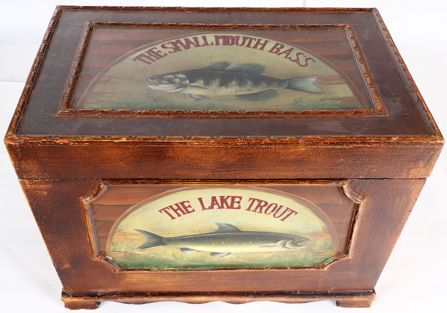 Large wood box, with fish paintings, 20 1/2'' x 13 1/2'' x 14'', all solid! Grade: Excellent - Value: 20 to 100