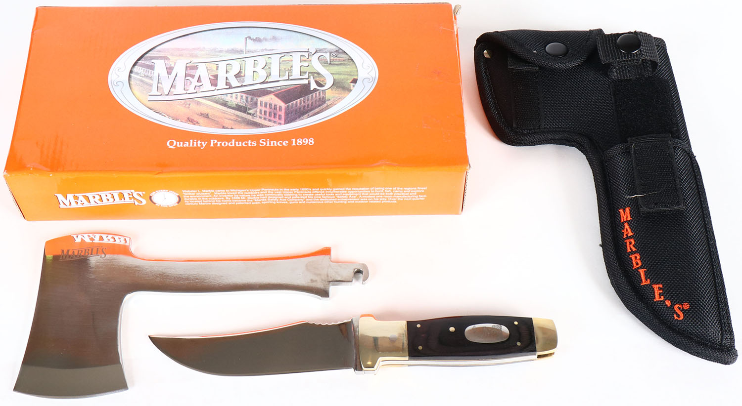 Marbles Hatchet and knife combo, MR 197, brand new, in box with sheath, very nice Grade: Excellent ++ - Value: 50 to 150