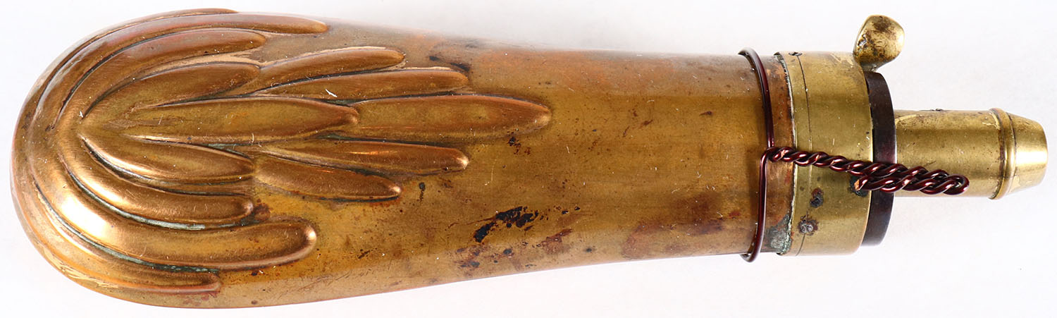 Small Brass Powder flask, unmarked with beautiful design, has age soiling Grade: Very Good - Value: 20 to 80