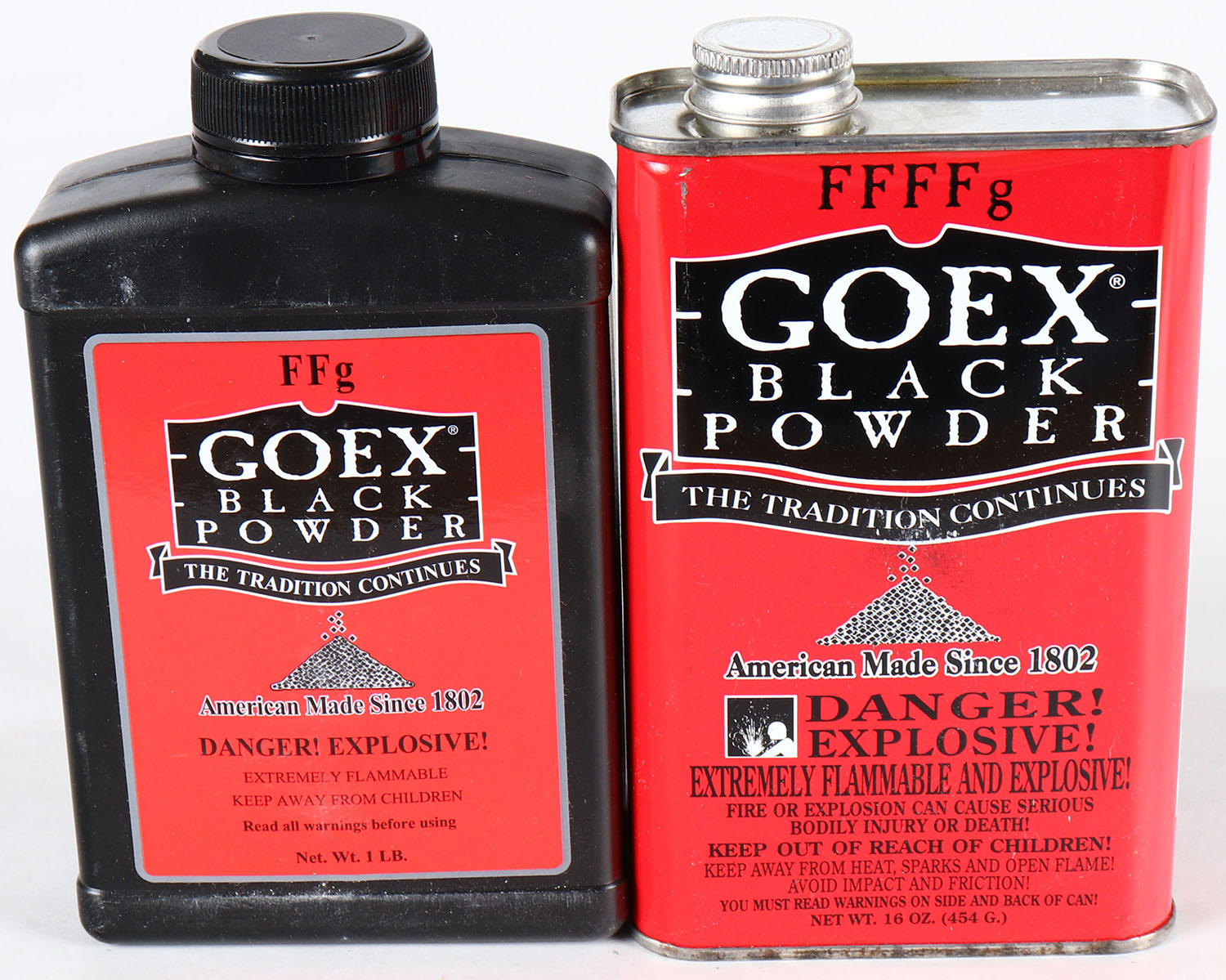 Lot of 2 Goex powder cans, FFFFg and FFg both FULL. Grade: Excellent ++ - Value: 20 to 80