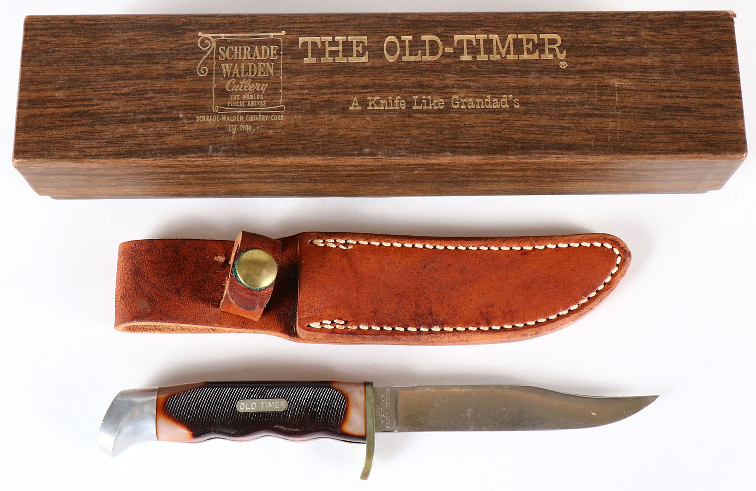 Schrade Walden The Old-Timer knife, fixed blade, has leather sheath and orignal box, 4'' blade. Grade: Excellent - Value: 20 to 60