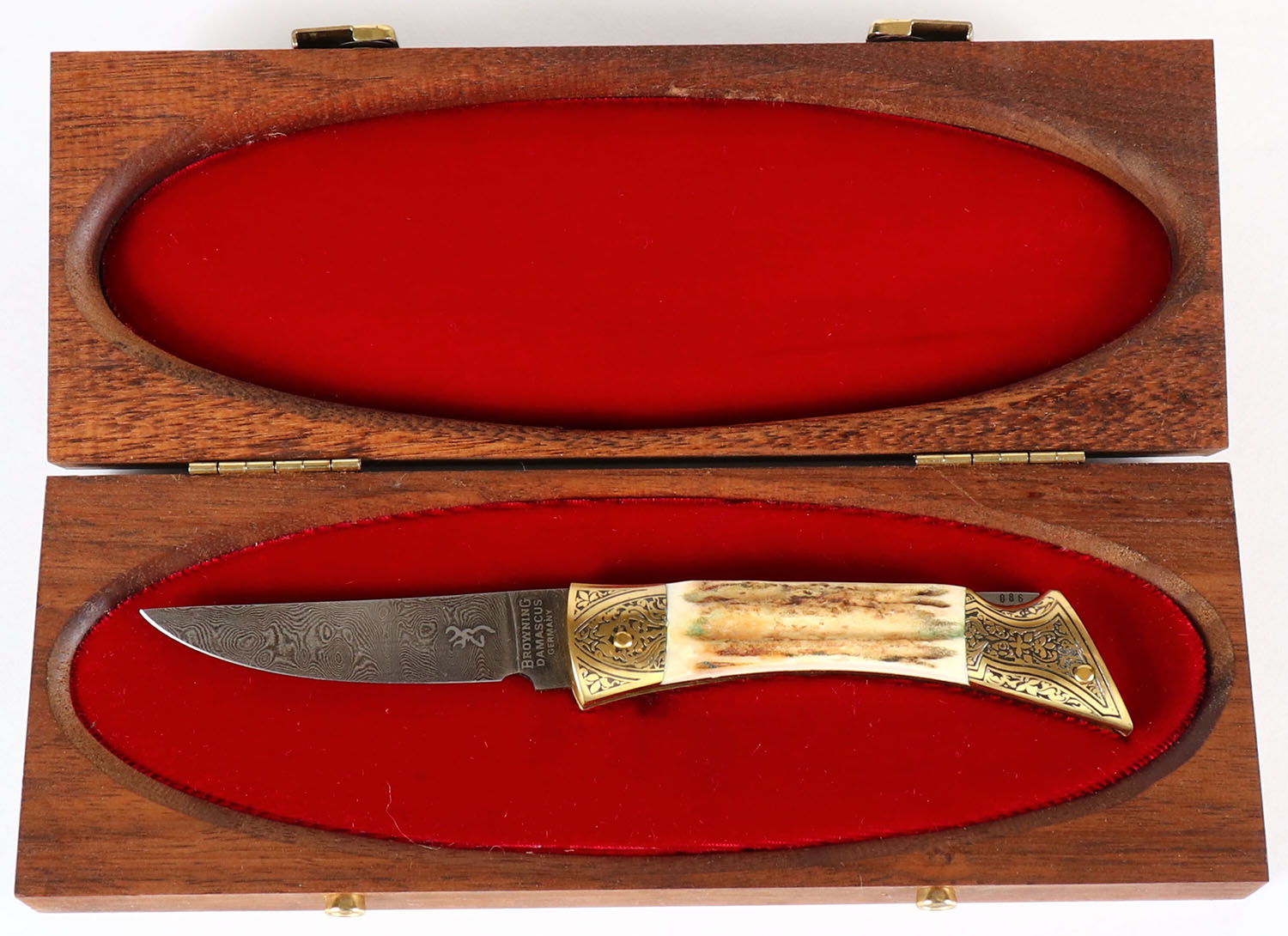 RARE! Browning damascus knife, 3'' blade, intricit design on blade, stag handle, in original box. Grade: Excellent ++ - Value: 50 to 150