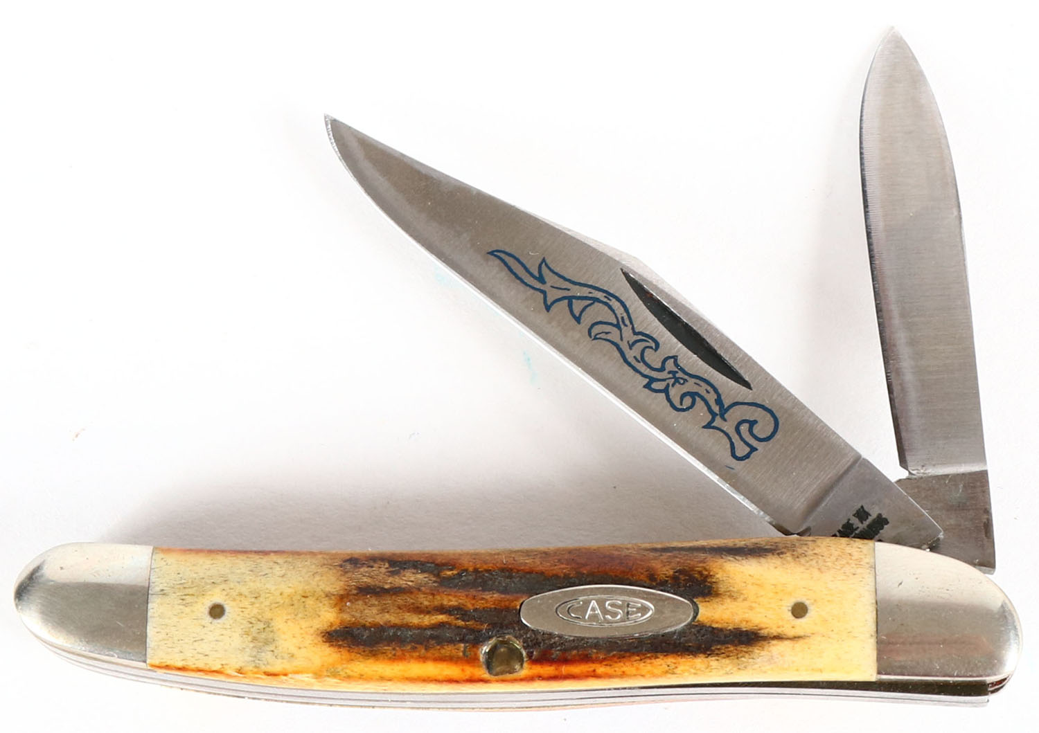 Case folding knife, #52087 SSP, 2 blade, 2 1/2'' longest blade, solid and clean, stag grip. Grade: Excellent - Value: 16 to 60
