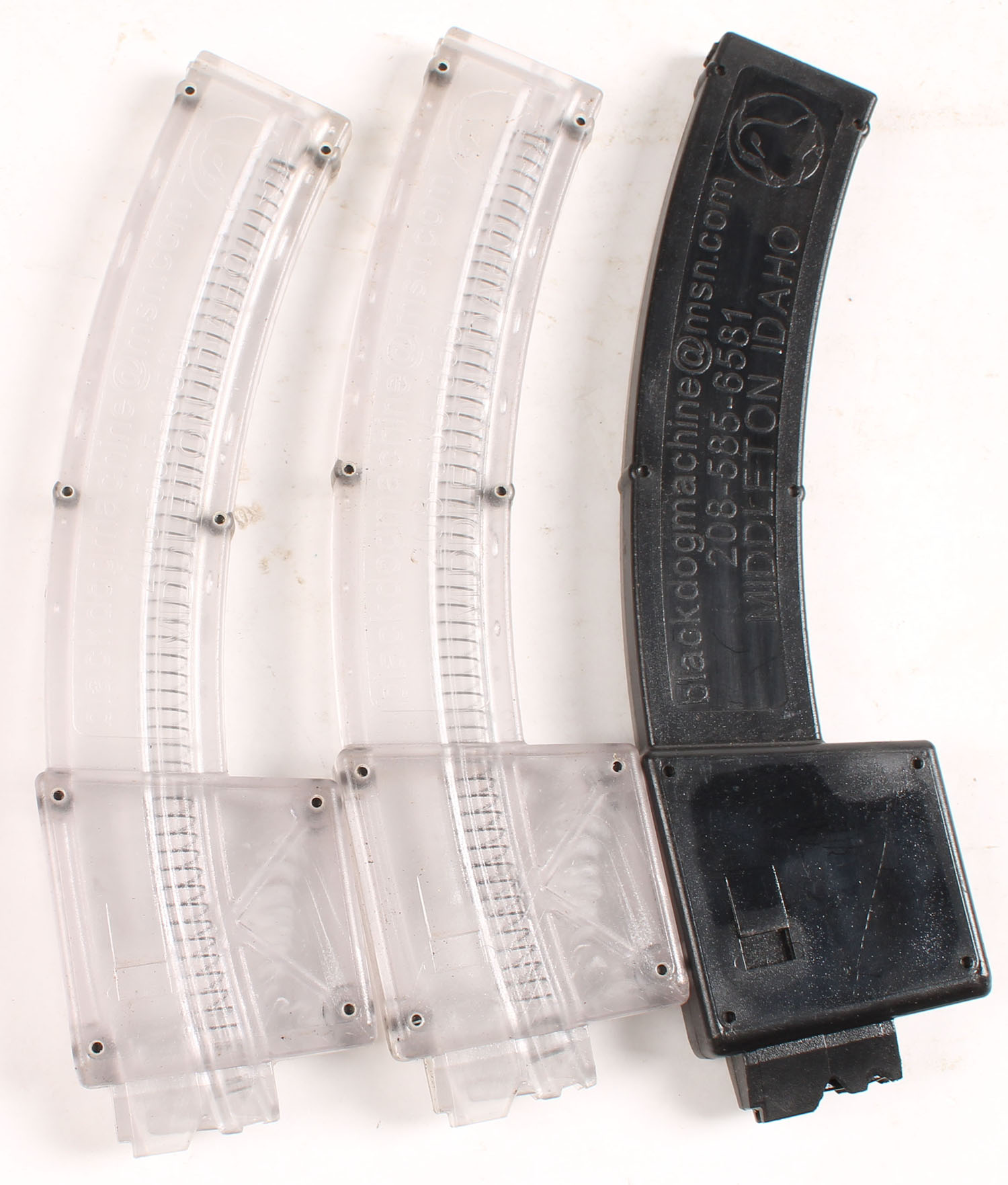 Lot of three, Black Dog Machine, AR-15/.22 LR /30Rd magazines, one black two clear plastic. Grade: Excellent - Value: 30 to 60