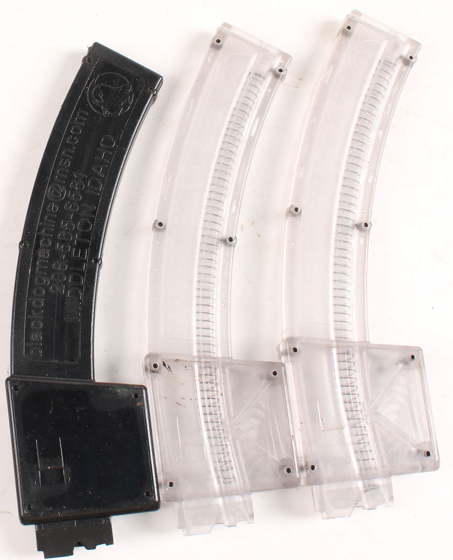 Lot of three, Black Dog Machine, AR-15/.22 LR /30Rd magazines, one black two clear plastic. Grade: Excellent - Value: 10 to 60