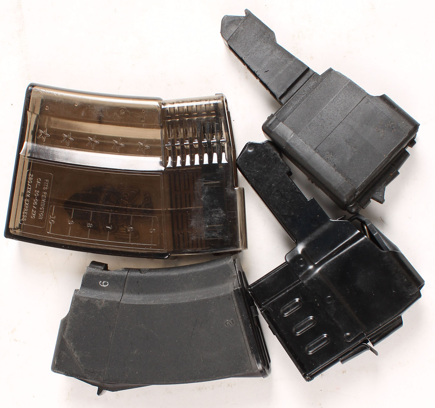 Lot of four magazines, two SKS mags one metal one plastic, one Izhevsk 7.62x39mm 10Rd. AK mag, & one Eagle International, 10Rd Remington mag for .30-06/ .270/ .280.7mm Express. Grade: Excellent - Value: 30 to 120