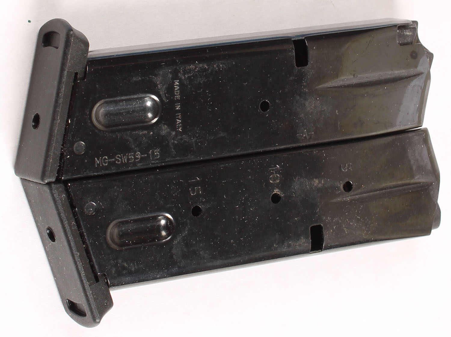 Lot of two, Smith & Wesson 5900 Pistol Series 9mm 15 Rd. mags, made in Italy. Grade: Excellent + - Value: 30 to 60