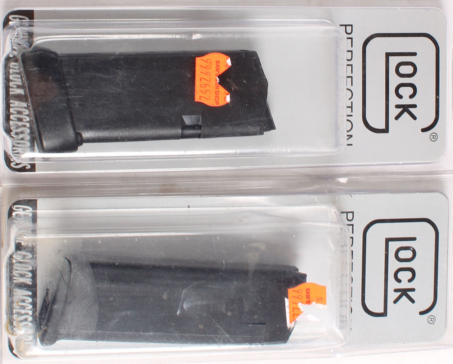 Lot of two Glock mags, one .45 Cal 10 Rd. mag, & one .40 Cal 13 Rd. mag, both in original packaging. Grade: Excellent - Value: 30 to 60