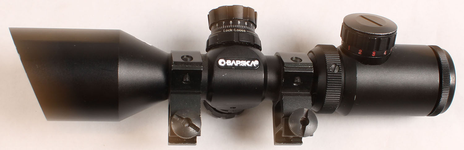 Barska, 3-9x 42mm Illuminated reticle scope, locking high turrets, 1/4 MOA adjustments, clicks are positive & audible, fixed parallax, adjustable focus, comes with .22 rail scope rings. Grade: Excellent - Value: 40 to 80