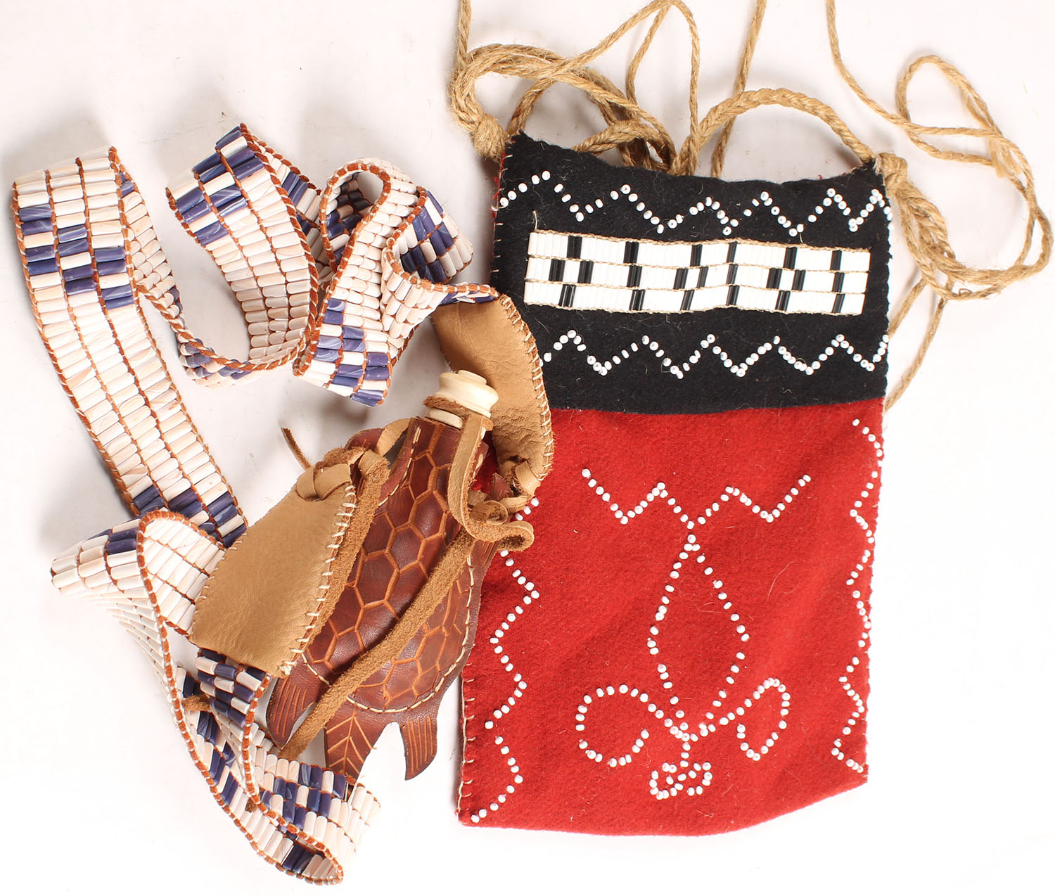 Lot of 2 leather and cloth pouches with necklace, 1 empty and 1 has larger lead balls. Grade: Excellent - Value: 10 to 100