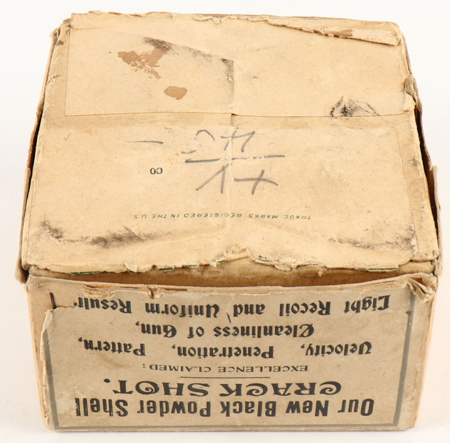 The Austin Cartridge Co., Crack-Shot Shell, Empty, shot size 1, incorrect bottom, buff box with multi colored label pictures dog on top, a shell on one side & black print on other side, box has age soiling with light scuffing. Grade: Very Good - Value: 100 to 400
