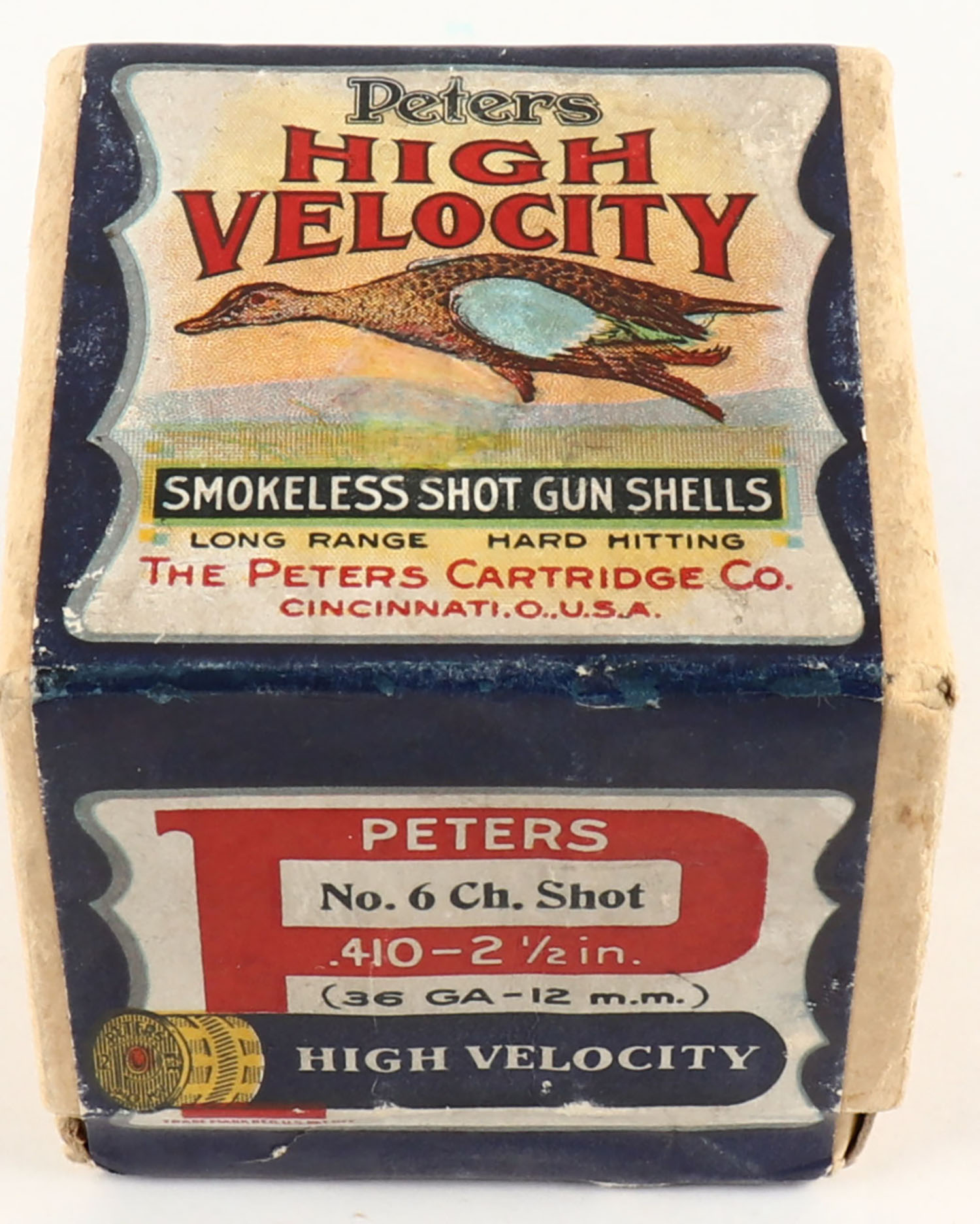 Peters Cart. Co., Blue Wing Teal, 410ga., 2 1/2'', 2pc., FULL & SEALED, shot size 6CH, buff box with multi colored label that pictures Blue Wing Teal in flight, box is very solid with very good label, has light scuffing. Grade: Excellent ++ - Value: 1000 to 3000