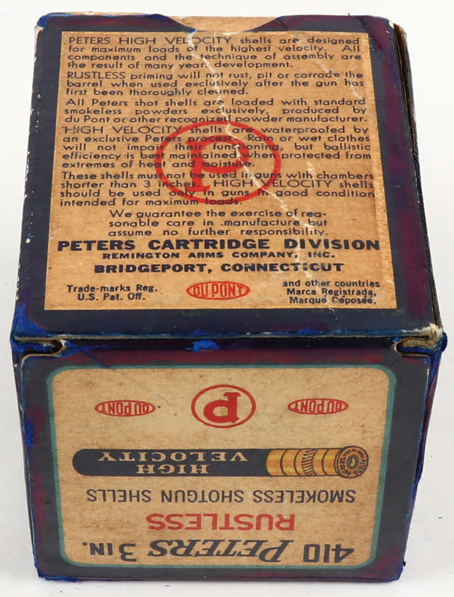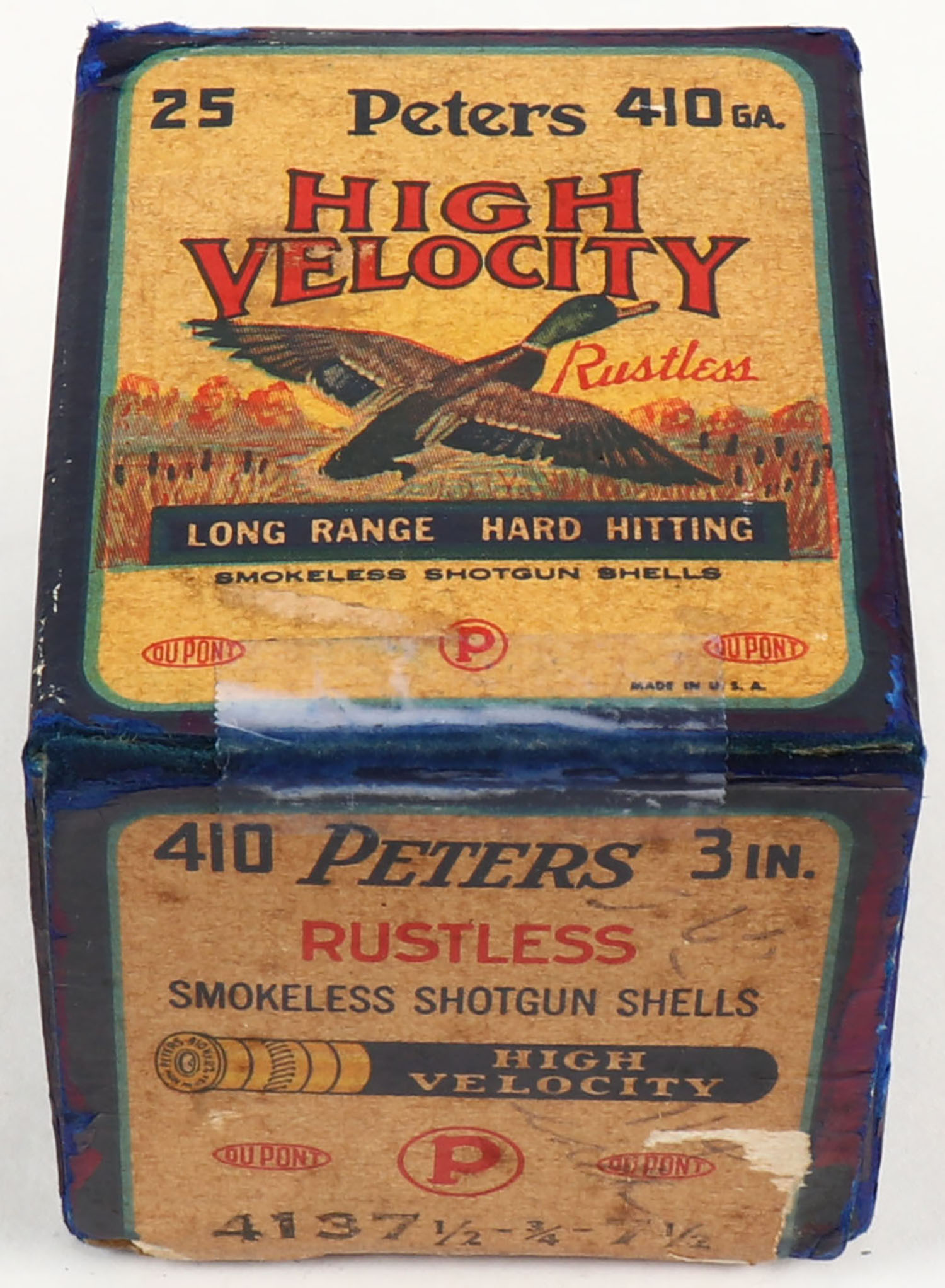 Peters, High Velocity, 410ga., 3 in., 1pc., Full of mixed shot sizes, shot size 7 1/2 & 6, multi-colored box with mallard duck flying out of marsh grass, box has been touched up, has a seam split with a tape repair, shells are very good. Grade: Very Good ++ - Value: 20 to 80