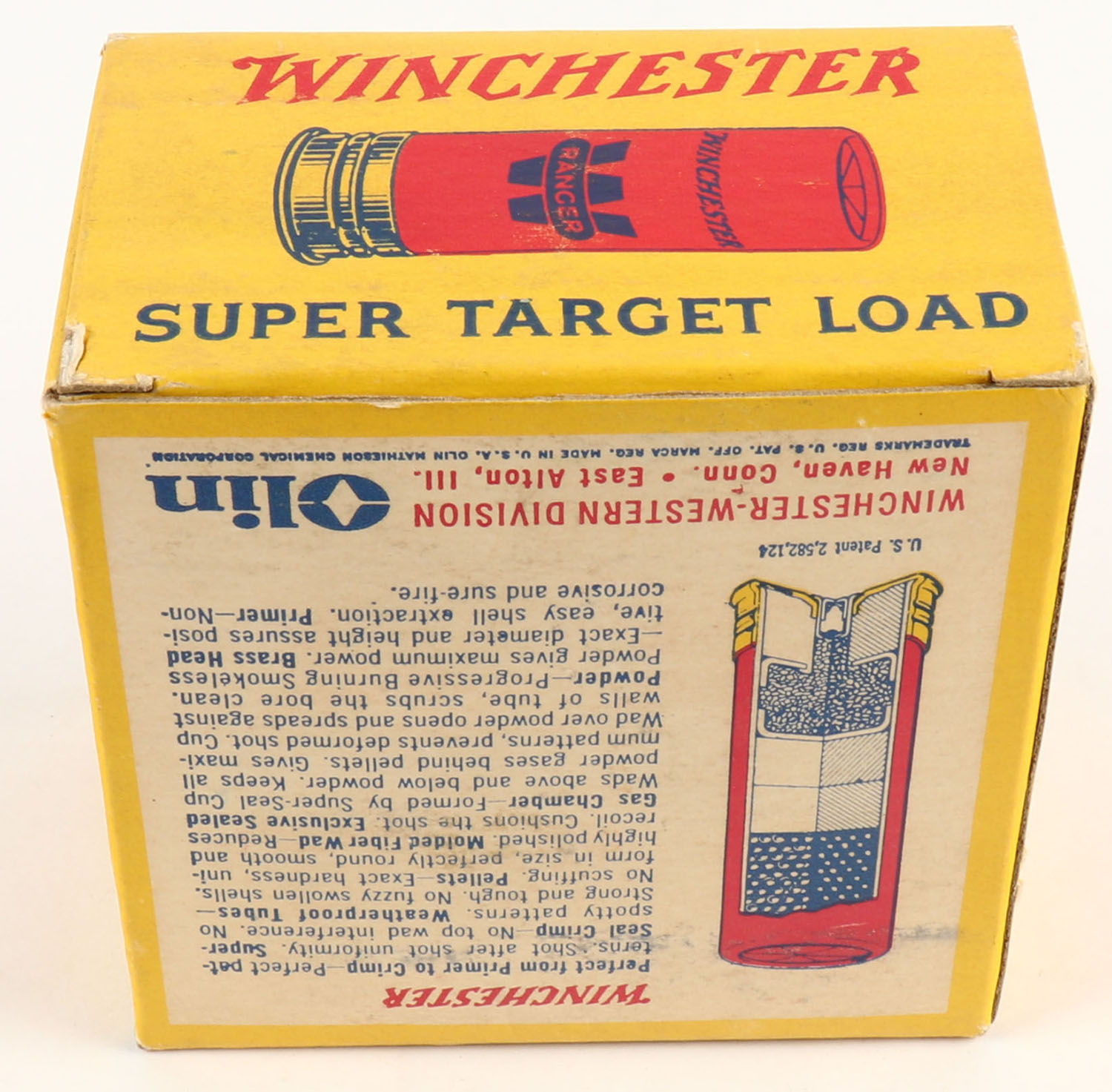 Winchester, Ranger Super Target Load, 12ga., 1pc., Full, Shot size 9 Skeet, red, white, & yellow box, Boz is very solid with very nice colors, paper shells are excellent. Grade: MINT - Value: 20 to 60