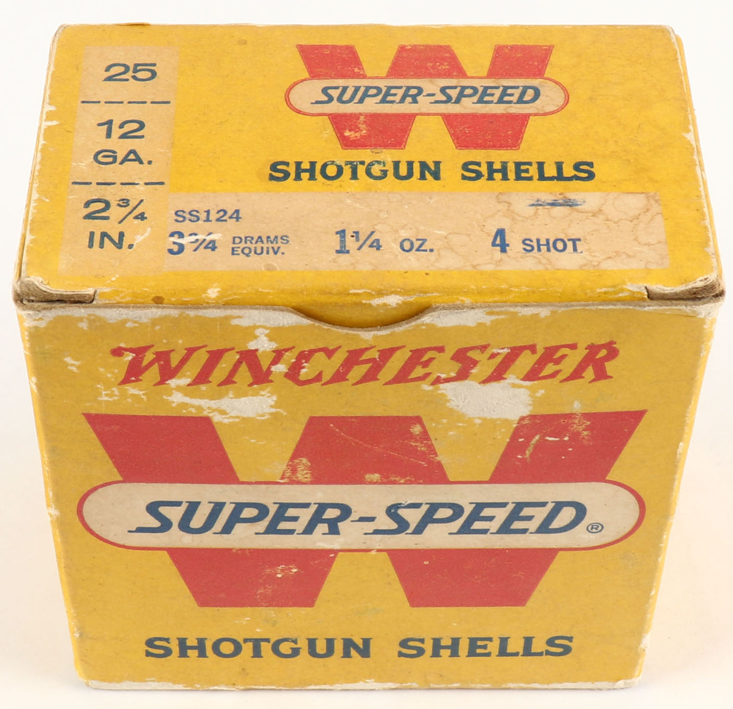 Winchester, Super Speed, 12ga., 2 3/4'', 1pc., Full with 13rds. Being correct, shot size 4, red, white & yellow box, box has light scuffing & light edge wear with great colors, shells are excellent. Grade: Very Good - Value: 10 to 30
