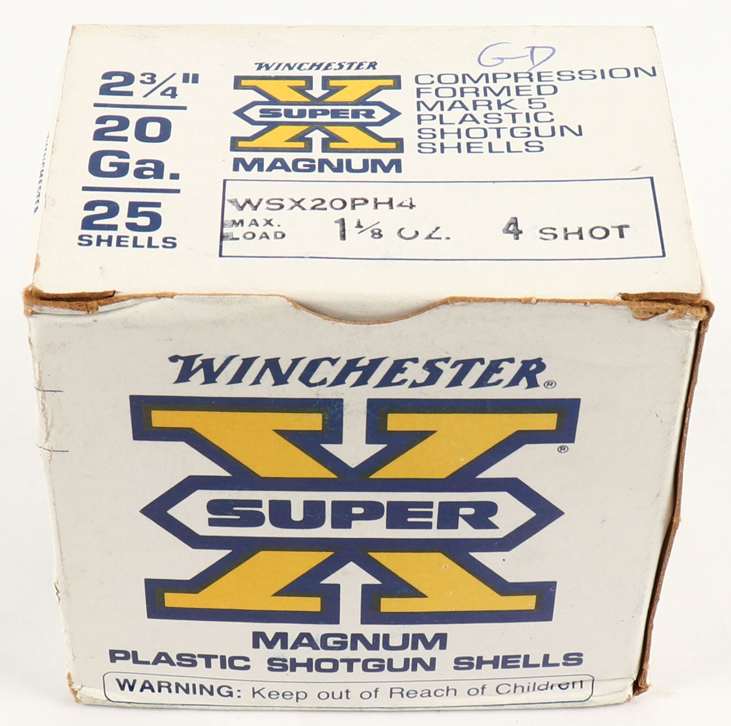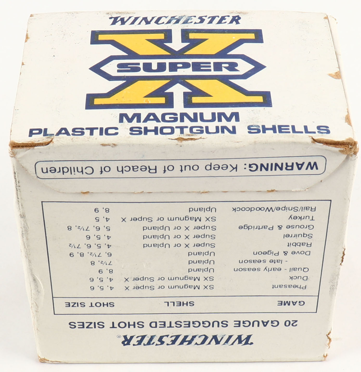 Winchester, Super X, MAGNUM 20ga., 1pc., Full, Shot size 4, yellow, blue & white box, box has light scuffing, plastic shells are excellent. Grade: Excellent - Value: 10 to 30