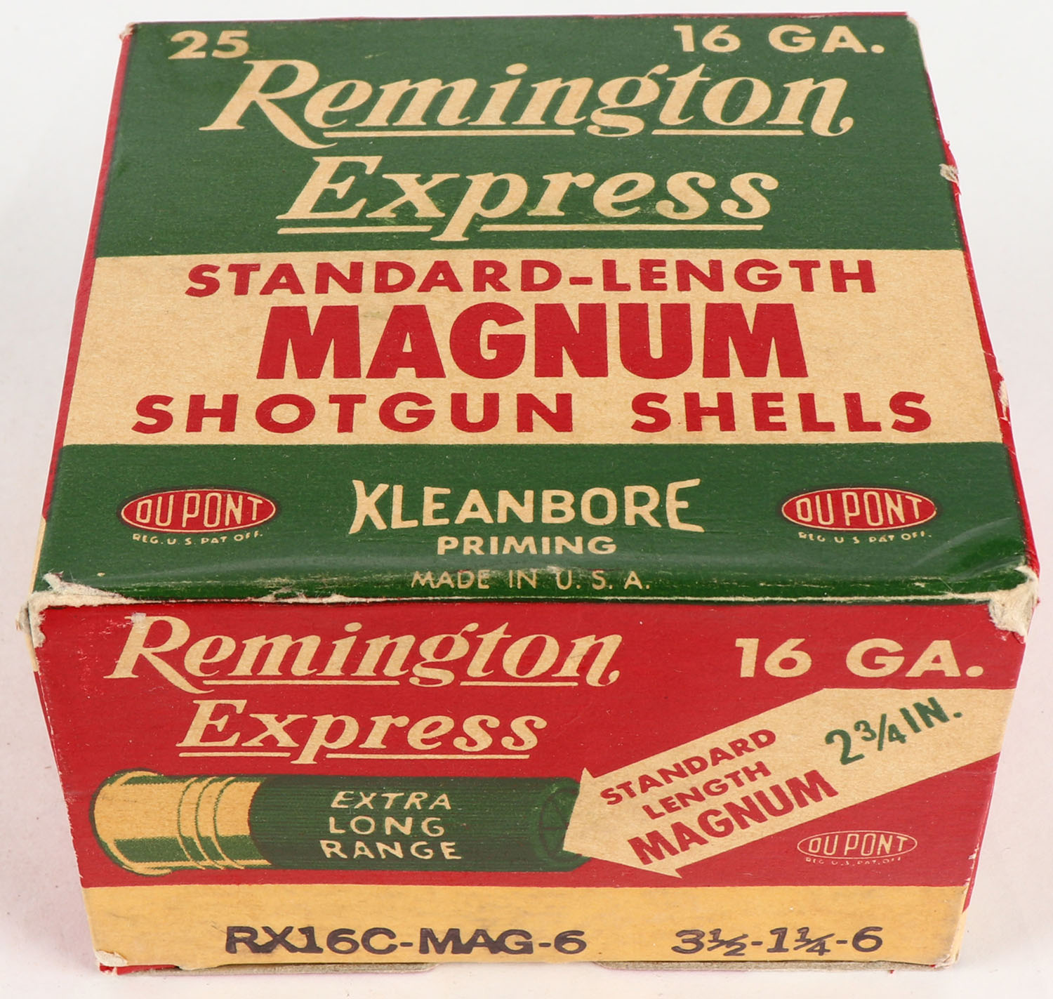 Remington Express, Standard Length Magnum, 16ga., 2 3/4'', 1pc., Full, shot size 6, box is red, white and green, box is very solid with great colors, plastic shells are excellent. Grade: Excellent + - Value: 10 to 40