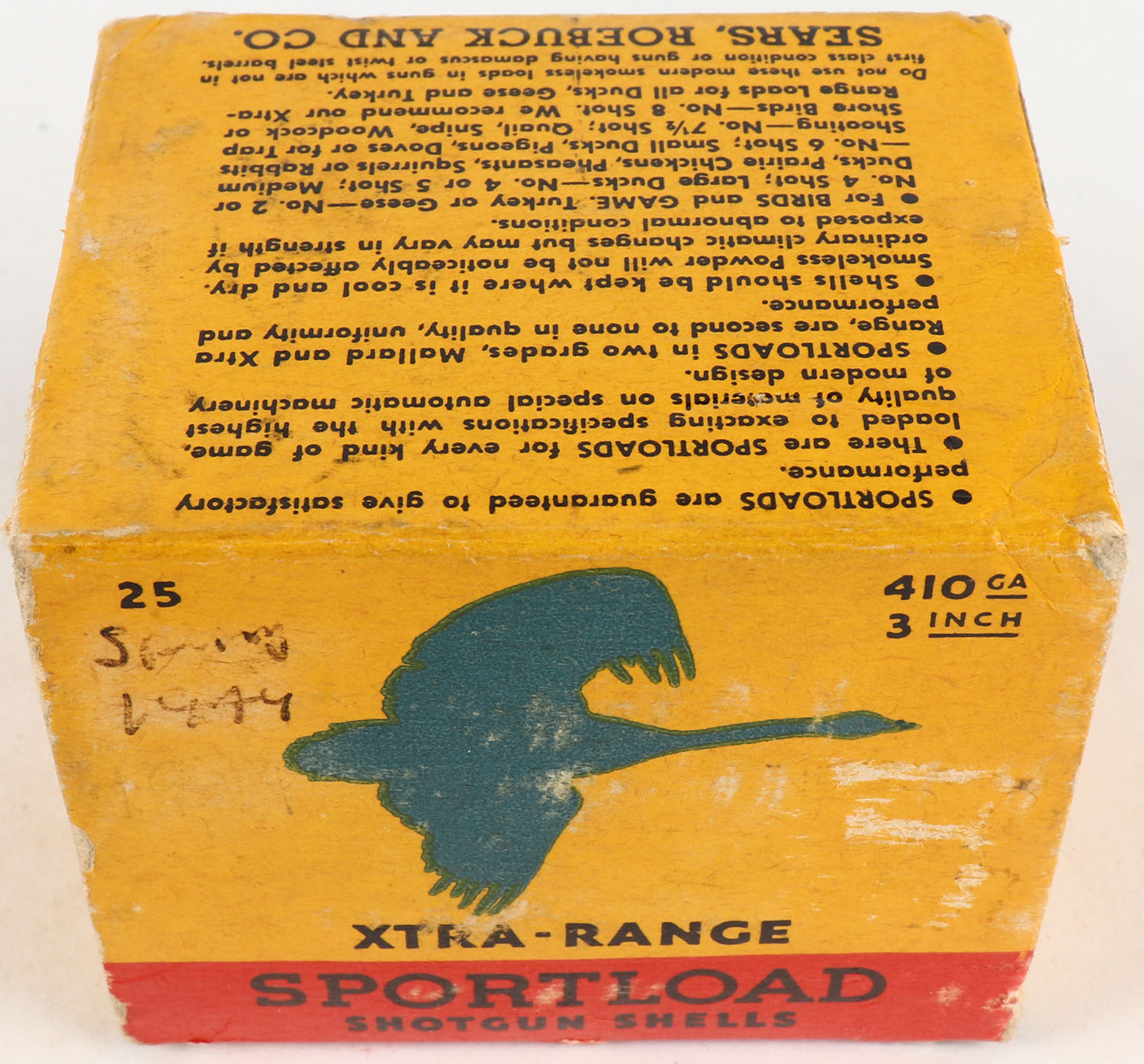 Sears Roebuck & Co., Sportload XTRA-RANGE, 410ga., 1pc., Full, 3'', shot size 6, yellow, blue & red box that pictures a Goose in flight, box has light age soiling & scuffing, paper shells are very good. Grade: Very Good - Value: 20 to 100