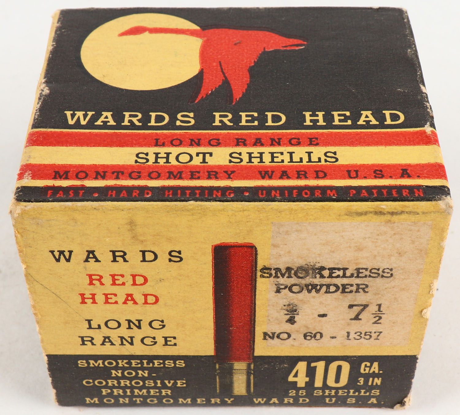 Montgomery Ward, Red Head, 410ga., 1pc., Full, 3'', shot size 7 1/2, black background with red goose flying through the moon, box has light scuffing with great colors, paper shells are very good. Grade: Excellent - Value: 40 to 100