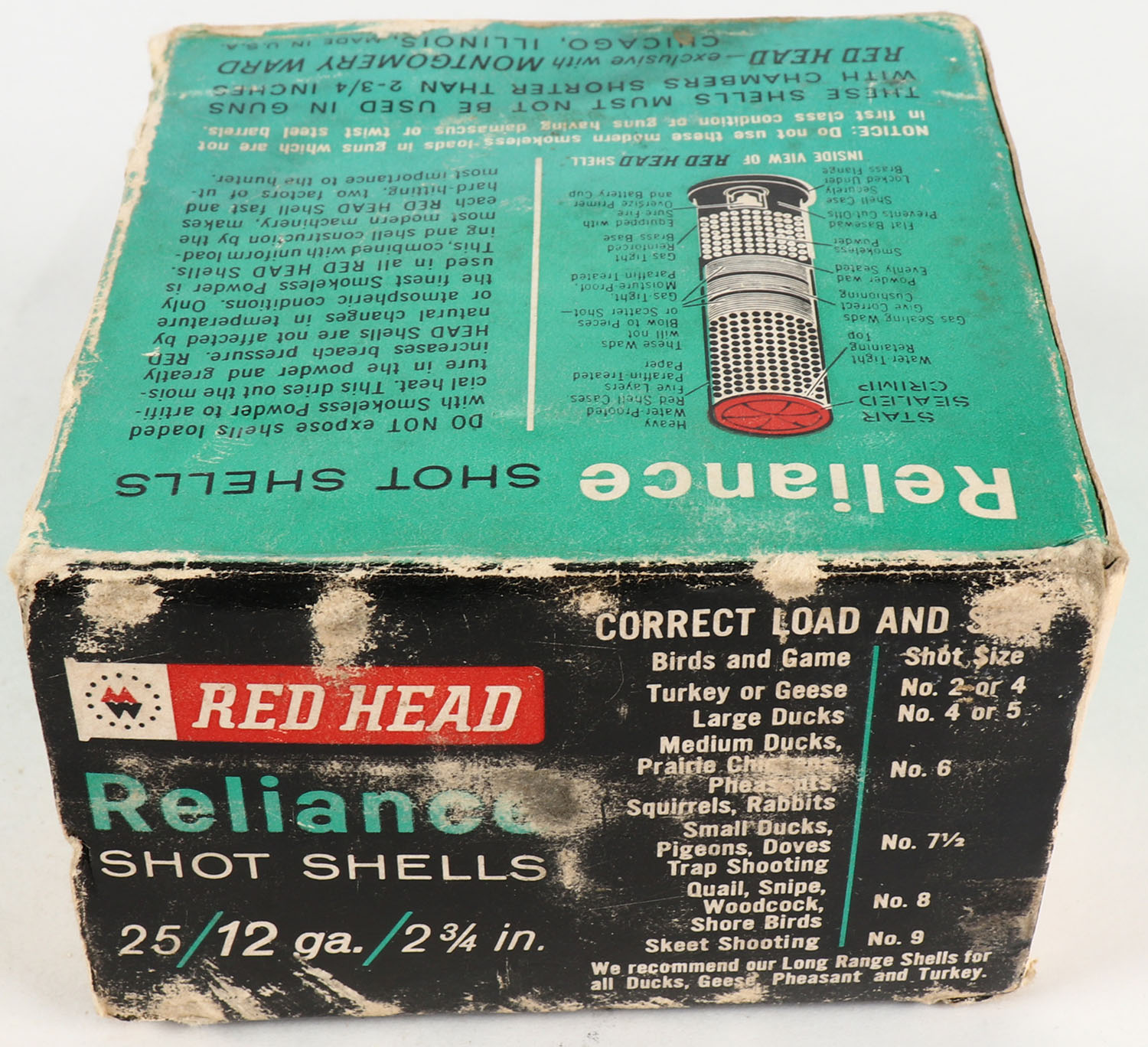 Montgomery Ward Red Head, 12ga., 1pc., Full, shot size 6, box has age soiling with scuffing, paper shells are excellent. Grade: Good ++ - Value: 10 to 30