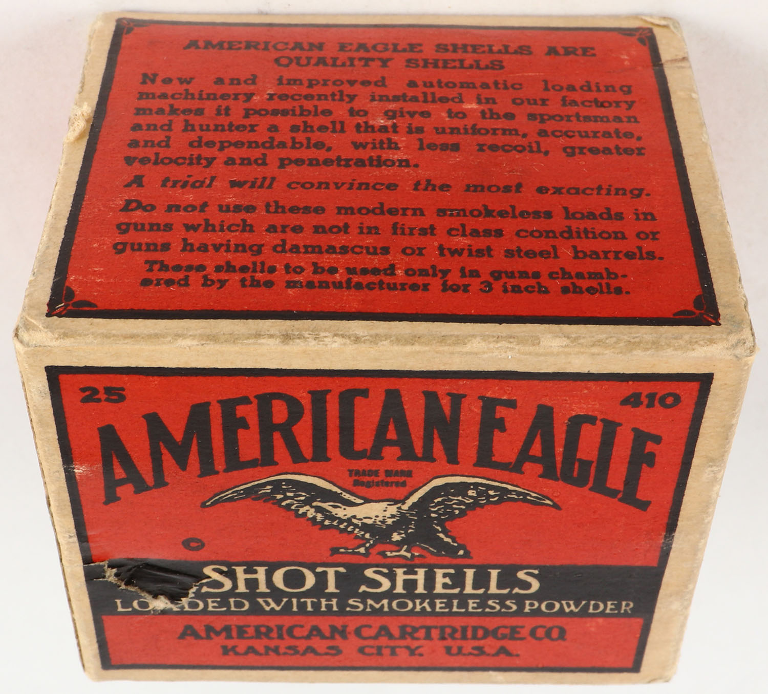 American Cart. Co., A-Grade, 410ga., 1pc., Full, shot size 7 1/2, buff, red & black box that pictures a flying eagle, box is very solid with very nice colors, paper shells are very good. Grade: Excellent - Value: 40 to 250
