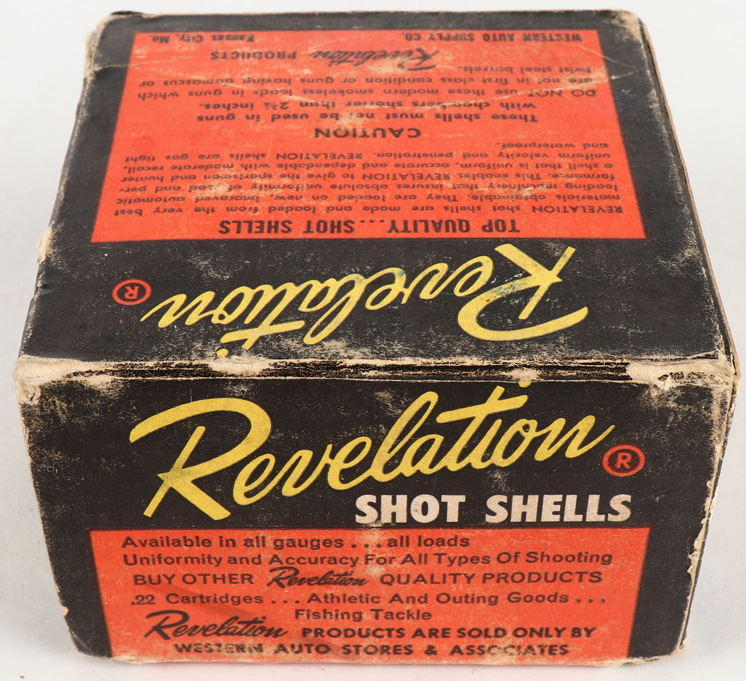 Revelation, Maximum Load, 16ga., 1pc., Partial with 17rds. Being correct, shot size 6, multi-colored box, box has age soiling & scuffing with edge wear, paper shells are good. Grade: Good ++ - Value: 8 to 30