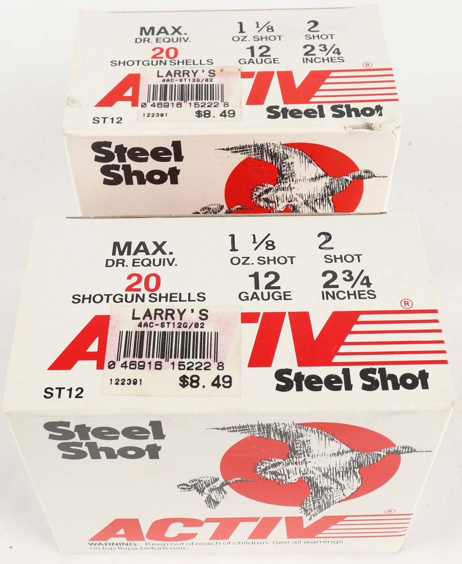 Lot of 2 ACTIV, 12ga., 1pc., Appears Full, shot size 2, multi-colored boxes. Grade: Excellent - Value: 10 to 40