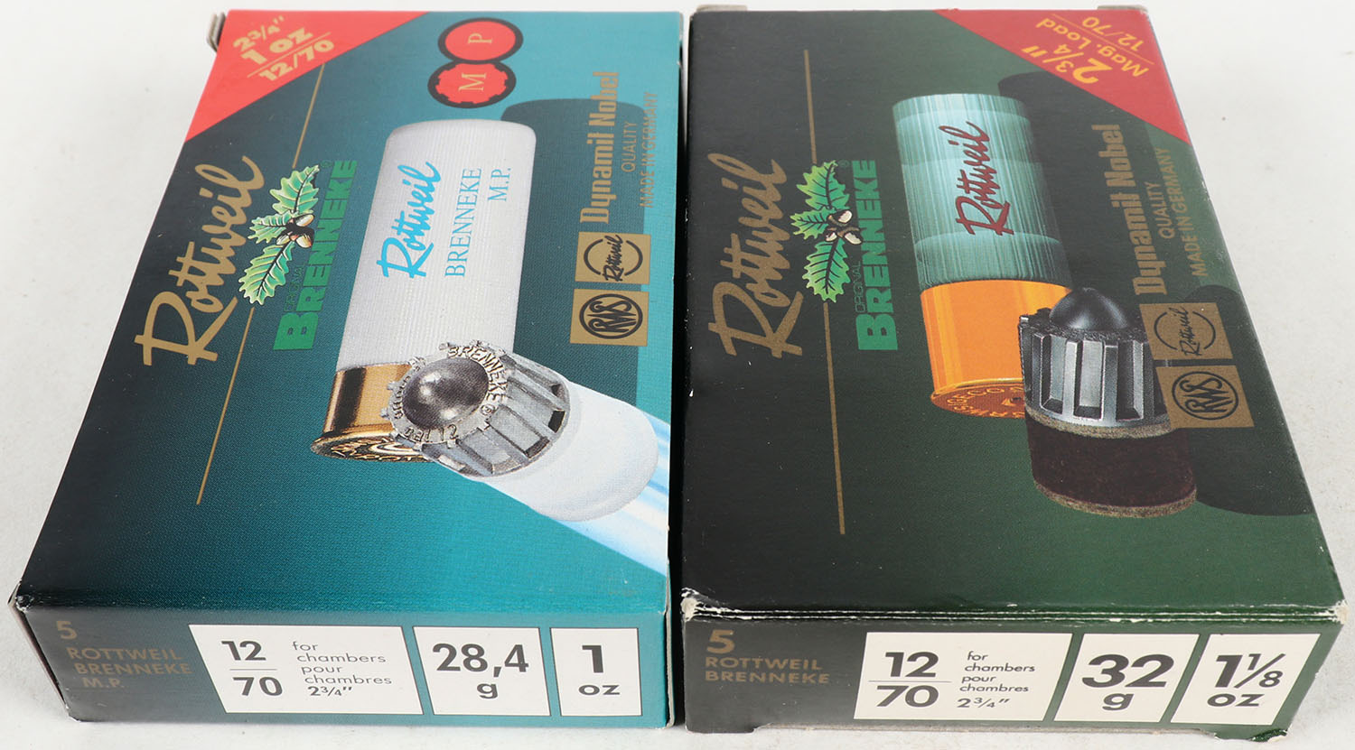 Lot of 2 Rottweil, 12ga., 1pc., Appears Full, shot size Rifled Slug, multi-colored box. Grade: Excellent - Value: 10 to 30