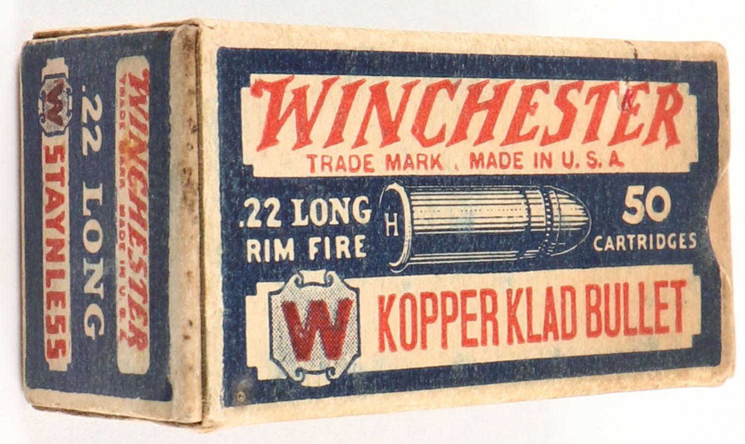 Winchester, Kopper Klad Bullet, .22 Long, RHWeb: WRA-12.5 L-1a, Full, 1pc. Blue white & red box, right end flap is torn, very good color, some age soiling & corner wear, very minor edge wear, left end flap is solid, ammo is minty. Grade: Good ++ - Value: 10 to 50