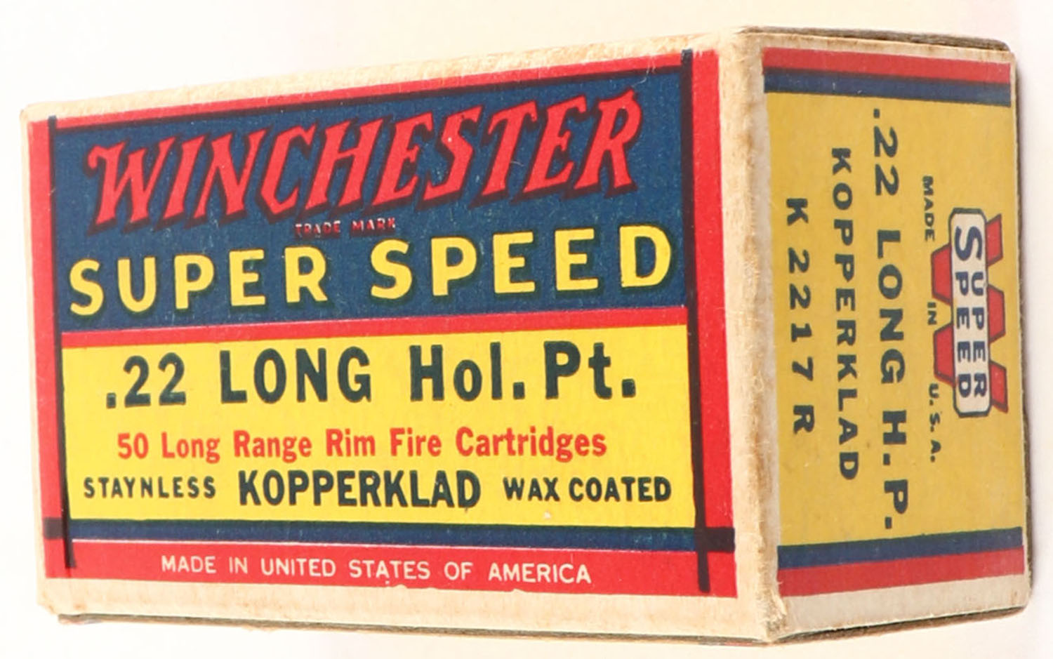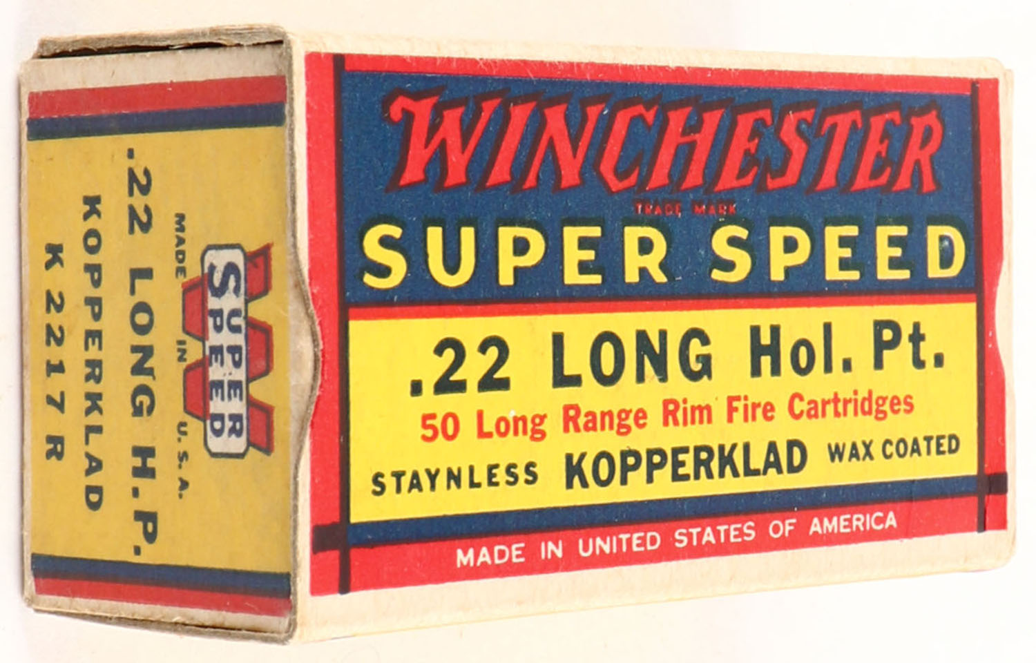 Winchester, Super Speed, .22 Long Hollow Point, Staynless Kopperklad, RHWeb: WRA-15 L-3, Full, 1pc. Yellow blue & red box, box is solid with excellent color, very minor corner wear, edges are crisp, end flaps are solid, ammo is minty. Grade: Excellent + - Value: 50 to 200