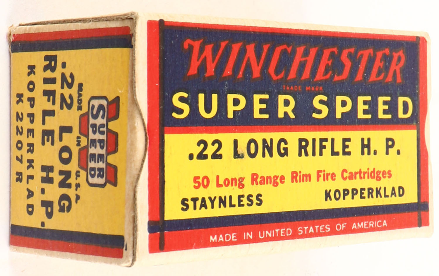Winchester, Super Speed, .22 Long Rifle Hollow Point, Staynless Kopperklad, RHWeb: WRA-16 LR-2b, Full, 1pc. Yellow blue & red box, box is solid with excellent color, very minor corner wear, edges are crisp, end flaps are solid, ammo is excellent. Grade: Excellent + - Value: 10 to 50