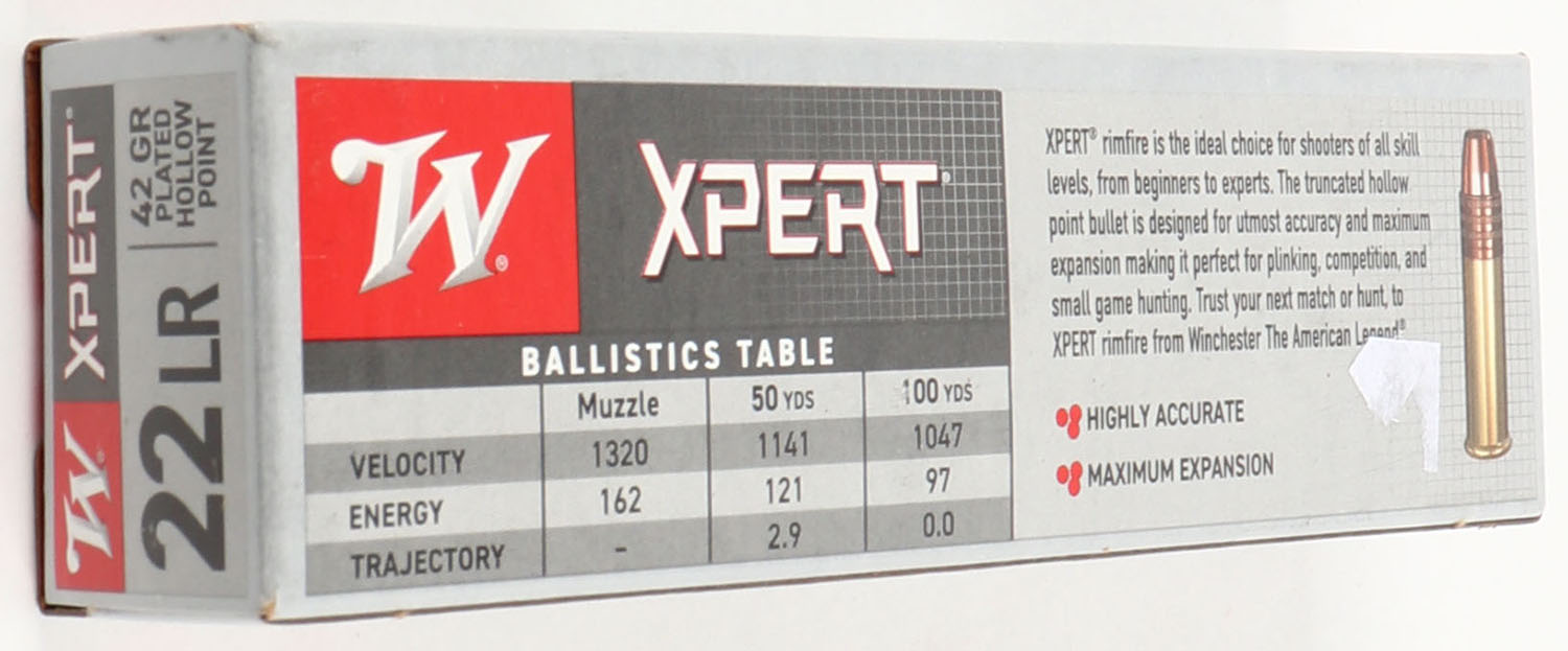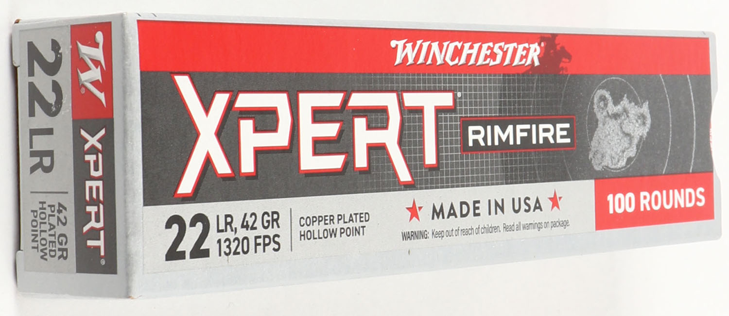 Winchester, Xpert, .22 Long Rifle, 42 Grain Copper Plated Hollow Point, 1320 FPS, Full, 100rds., 1pc. Gray red & white box, box is MINT with minty color, corners are sharp, edges are crisp, end flaps are solid, ammo is mint. Grade: MINT - Value: 12 to 36