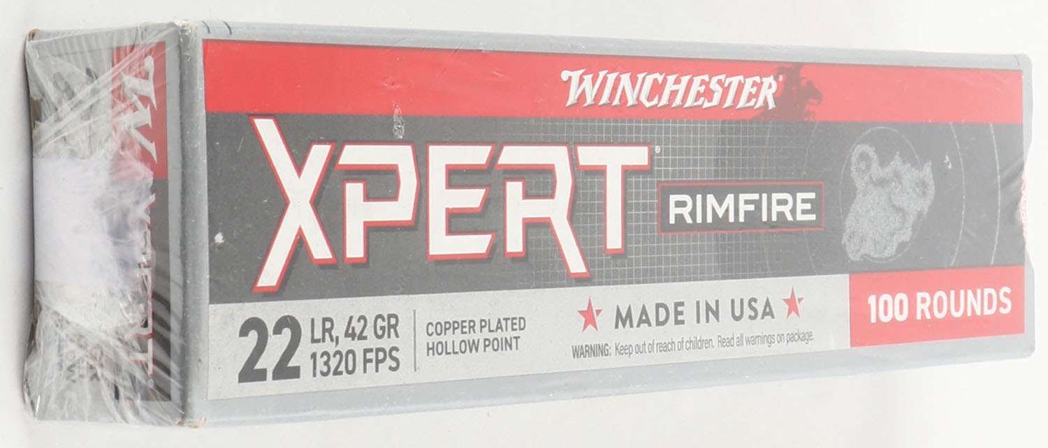 Winchester, Xpert, .22 Long Rifle, 42 Grain Copper Plated Hollow Point, 1320 FPS, Full, 100rds., 1pc. Gray red & white box, box is MINT with minty color, corners are sharp, edges are crisp, end flaps are solid, ammo is mint. Grade: MINT - Value: 12 to 36
