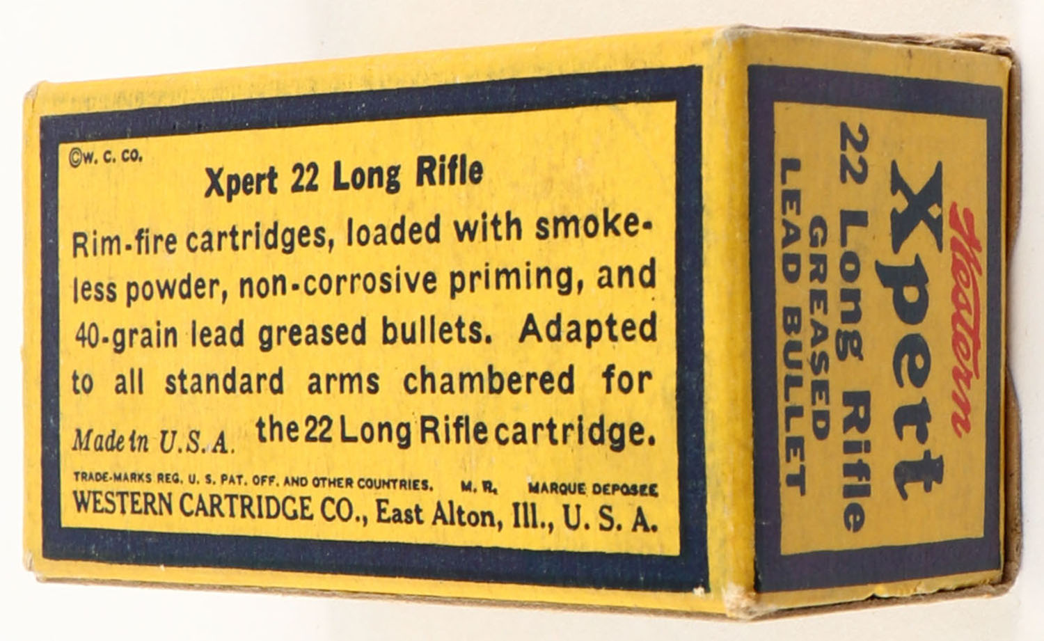 Western, Xpert, .22 Long Rifle, Greased Lead Bullet, RHWeb: WCC-52 LR-1n, Full, 1pc. Yellow blue & red box, box is solid with very good to excellent color, minor age soiling & shelf wear, some corner wear, edges are crisp, end flaps are solid, ammo is excellent. Grade: Excellent - Value: 16 to 60