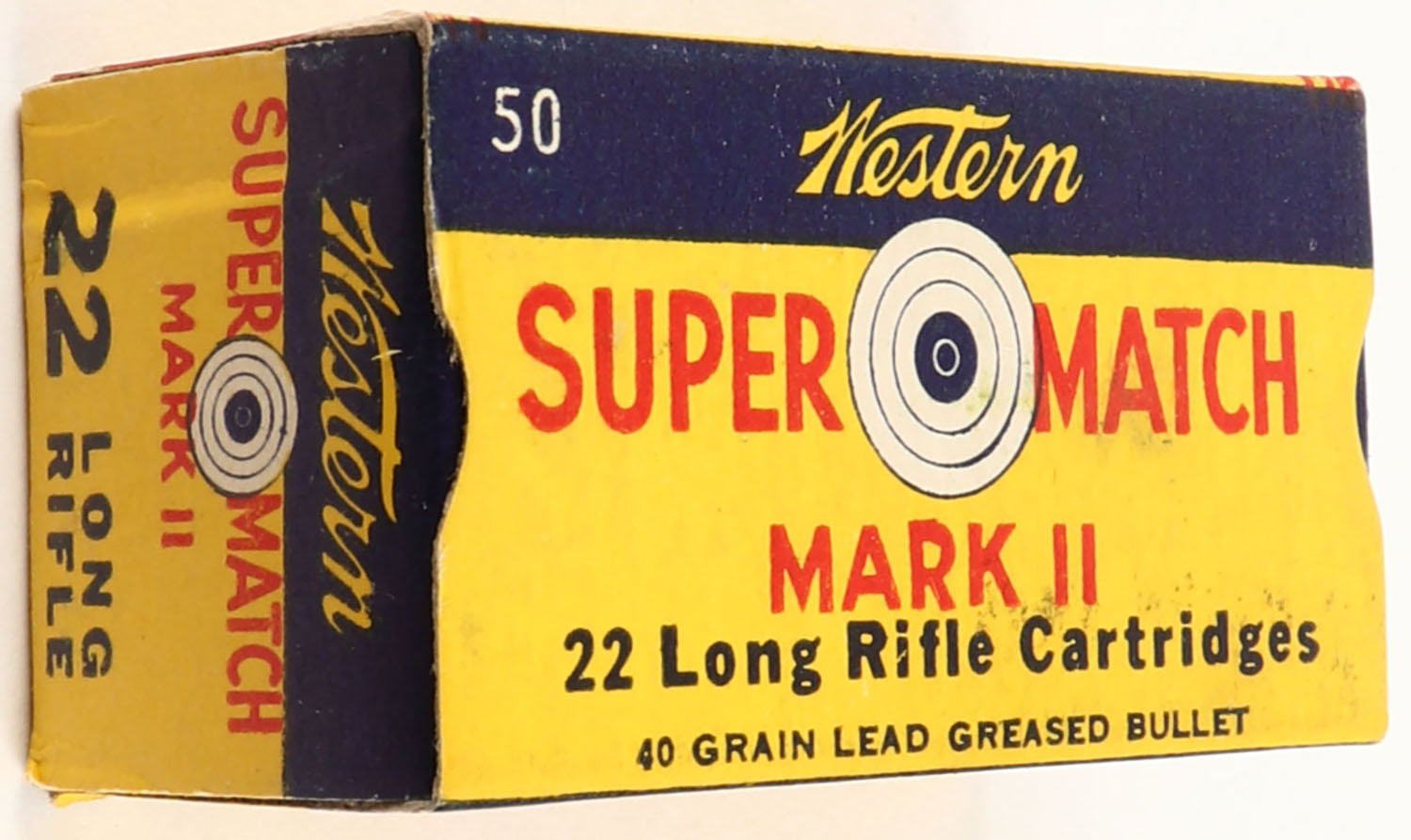 Western, Super Match Mark II, .22 Long Rifle, RHWeb: WCC-51.2 LR-3g, Full, 1pc. Yellow blue & red box, box is near mint with minty color, only very minor color bleeding, corners are sharp, edges are crisp, end flaps are solid, ammo is excellent. Grade: Excellent + - Value: 8 to 40