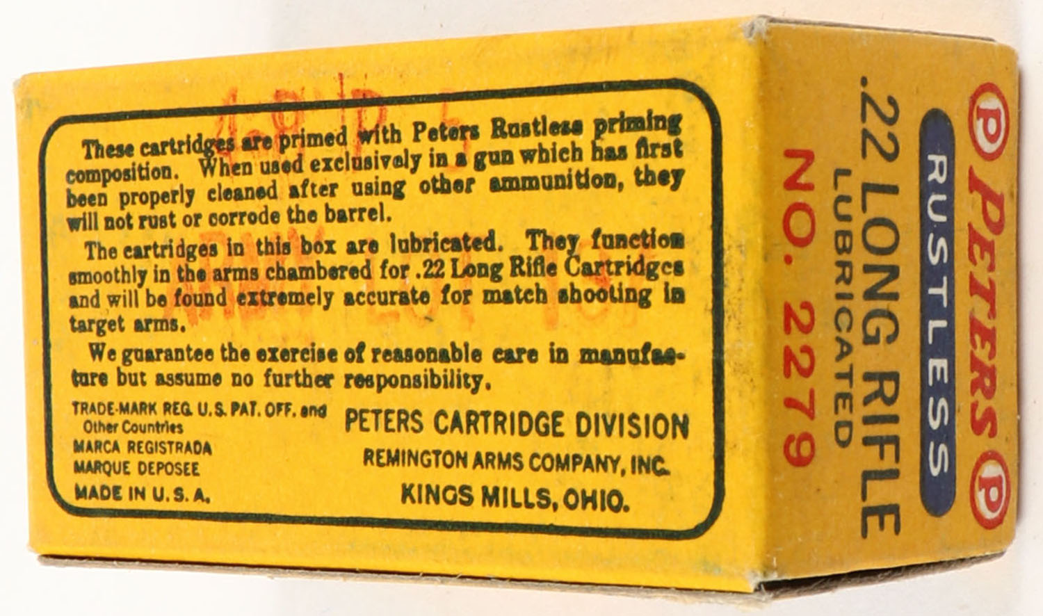 Peters, Rustless, .22 Long Rifle, Lubricated Bullet, Smokeless Powder, Army Lot 137, RHWeb: PCC-8C LR-2b, Full, 1pc. Blue yellow & red box, box is solid with excellent color, very minor color bleeding, corners are mostly sharp, edges are crisp, end flaps are solid, ammo is very good. Grade: Excellent + - Value: 16 to 60