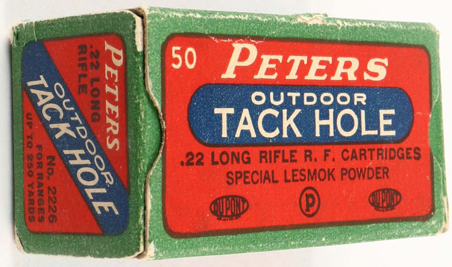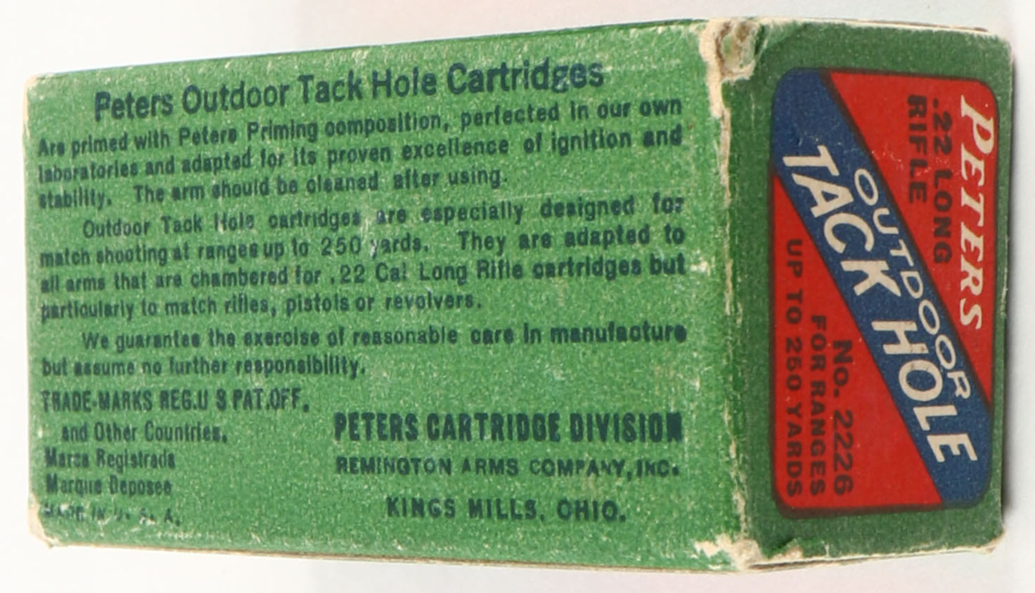 Peters, Outdoor Tack Hole, .22 Long Rifle, RHWeb: PCC-52 LR-11, Full, 1pc. Red green & blue box, box is solid with excellent color, very minor shelf wear, some corner wear, edges are mostly crisp, end flaps are solid, ammo is excellent. Grade: Excellent + - Value: 40 to 120