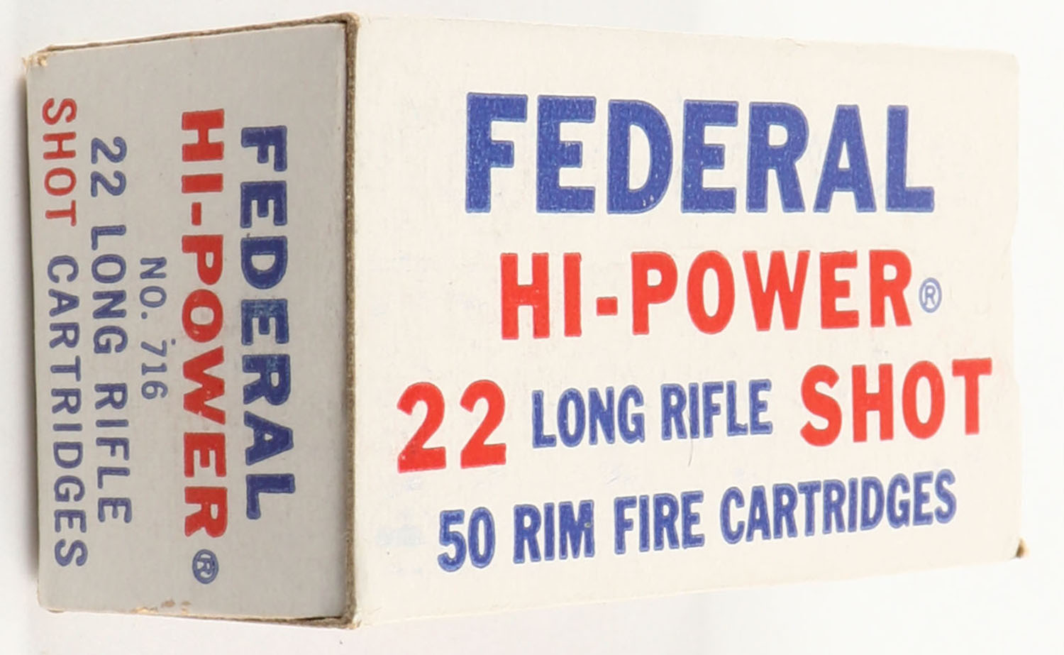 Federal, Hi-Power, .22 Long Rifle Shot, RHWeb: FED-8 LR-5a, Full, 1pc. White blue & red box, box is solid with excellent color, very minor age soiling & corner wear, edges are crisp, end flaps are solid, ammo is excellent. Grade: Excellent + - Value: 20 to 60